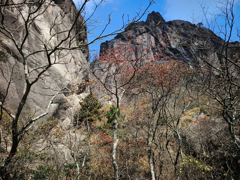 途径一个岔路口,指示牌上写着:丹霞峰。丹霞峰景色一般,本不在我此行的计划里,可是当我看到“丹霞峰”这三个字的时候,就如着了魔一般,鬼使神差的往峰顶走去。十年前的冬天,第一次来黄山,早早起床,摸黑爬上丹霞峰顶看日出,大雾弥漫,在峰顶挨了一小时的冻,什么也没看到。