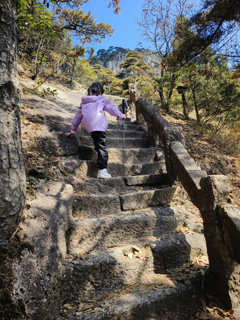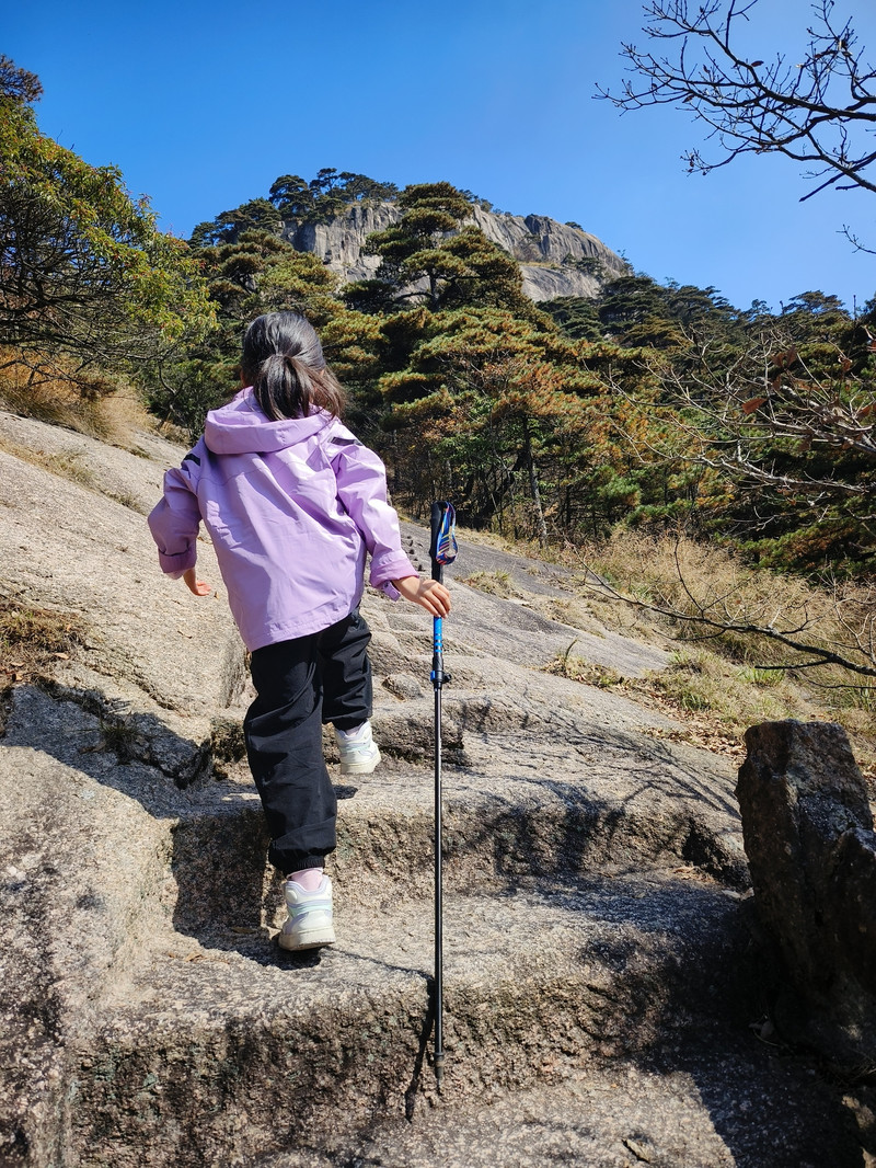 把行李放在宾馆,我们轻装上阵,这段路是我走的最轻松的了。这次登黄山,我背了一只大容量的登山包,里面装了孩子的换洗、防寒衣物、一次性雨衣,还有各种补给。遇到特别陡的路段,我一只手牵着孩子,有时脚下没踩稳,感觉能被身后的包拽着倒下去。