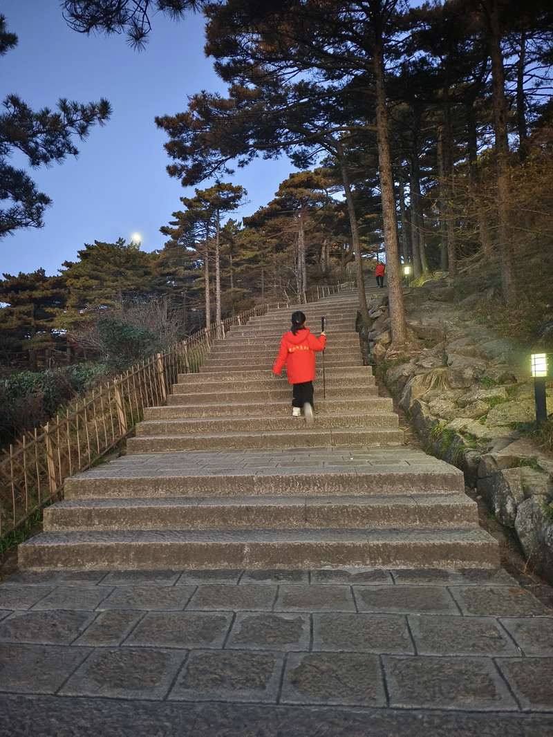 走在去光明顶的路上。夜色朦胧,月亮还挂在天上。