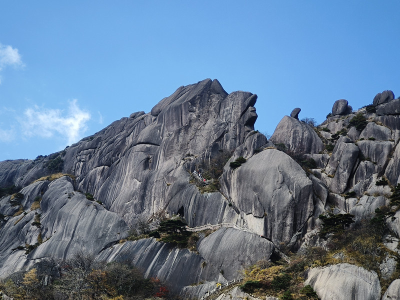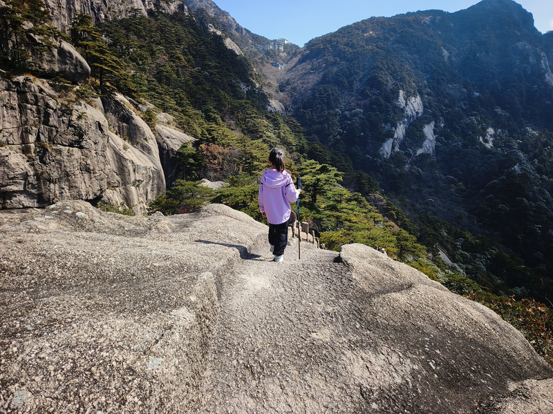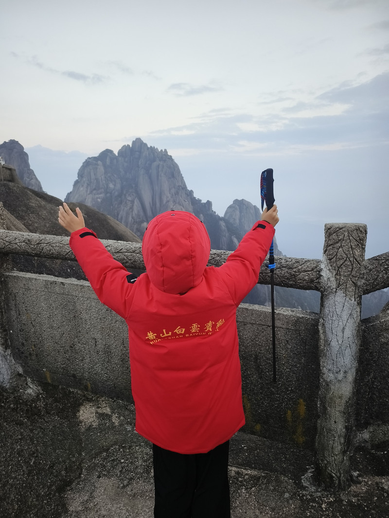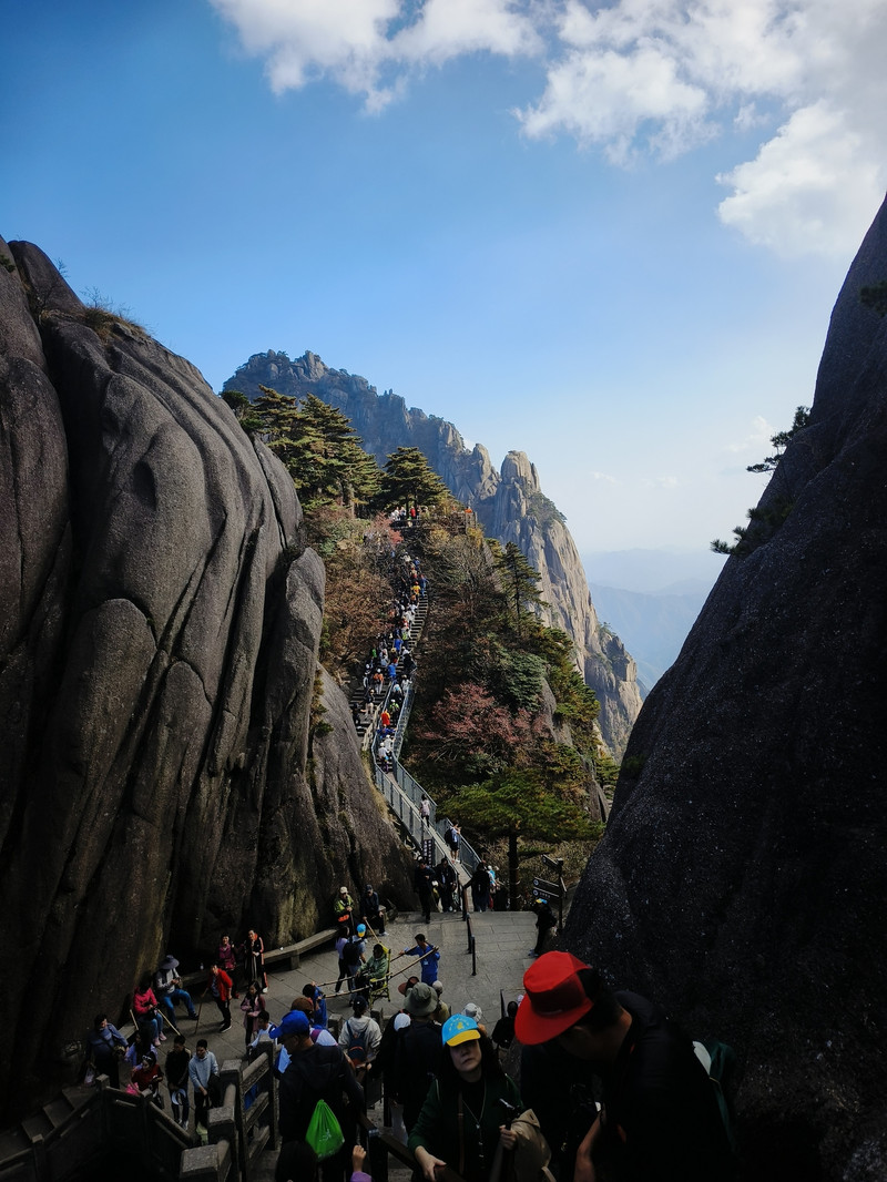 最后一段坡陡路窄,且没有台阶,游客又非常的多,人挤人。我一只手牵着孩子,一只手撑着登山杖,艰难的往上爬。下来的时候更加没有着力点,小朋友几乎要坐在地上往下滑。大家看到我一个人带着这么小的孩子,都伸出了援助之手,一个接一个把小朋友接下去了。这是此次黄山之行,最为暖心的时刻。