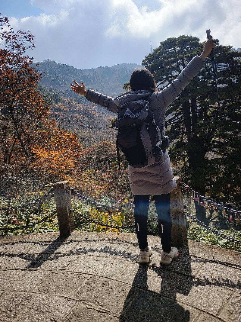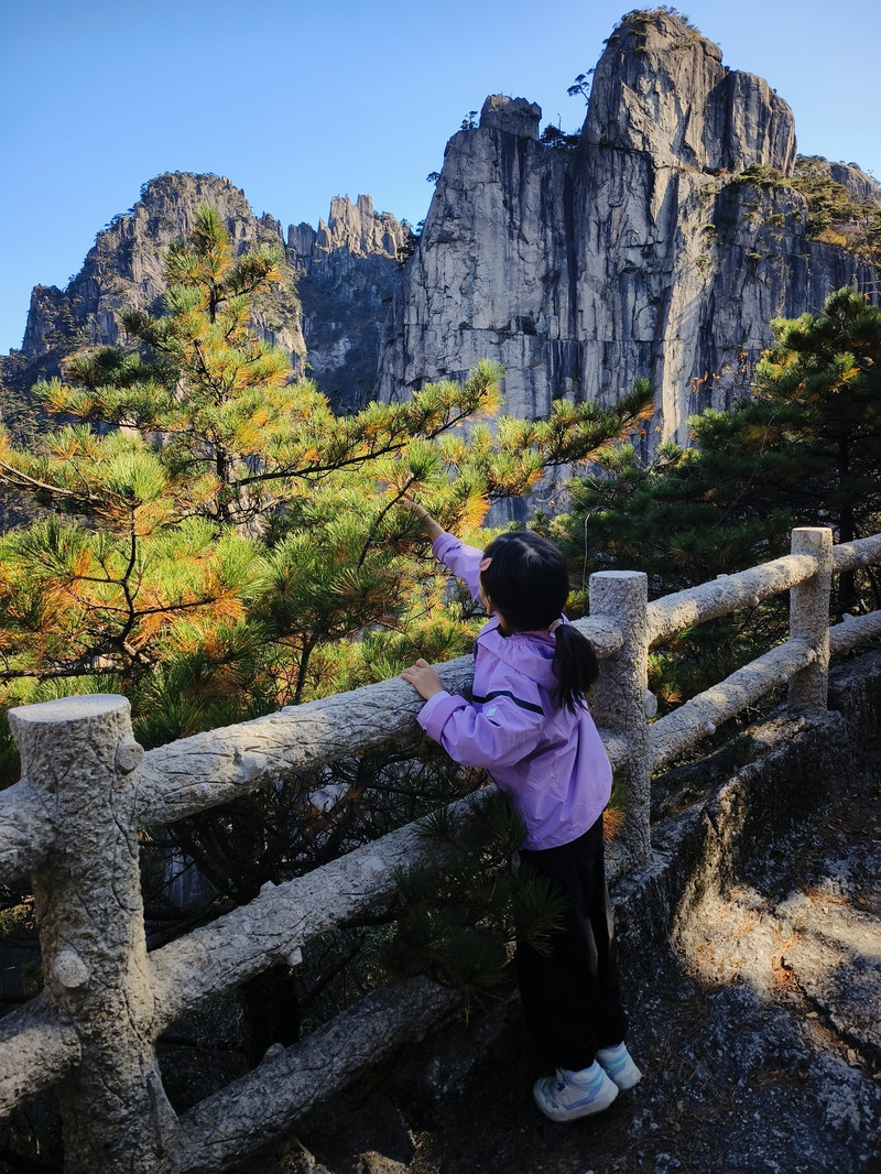 春天的时候,小朋友跟我说想去黄山看迎客松,老师在学校里给他们展示了迎客松的照片。我一直推脱着,不是很想带她去。因为对于她来说,还没有到会欣赏自然风光的年纪。于是我带她去了迪士尼、去了嬉戏谷、去了恐龙园。前段时间小朋友又开始念叨起黄山,那么好吧,在最美的季节,带上小朋友去看她心心念念的迎客松,而我,去欣赏黄山五彩斑斓的秋。