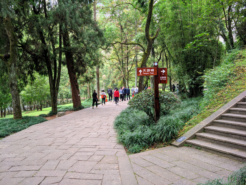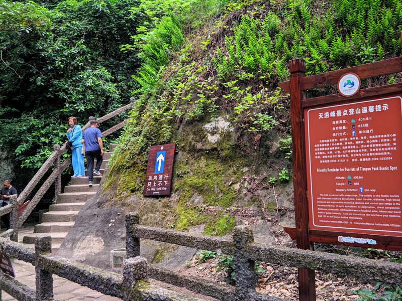 在此短暂歇息后,从伏虎岩处开始登山,这是天游峰的前山。抬头看天游峰并不是很高,但沿着步道逐级而上,并不高的天游峰却很陡峭。除了最初登山一小段,天游峰登山道是标示单行的。导游会提醒游客,继续登山就不能回头了,请量力而行。当然,你确实爬不上去,非要原路返回,也没人阻止你,但要注意安全。