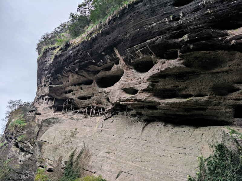 武夷山古崖居遗址多达数十处,章堂涧边的丹霞嶂崖壁上的天车架为被人津津乐道,它是山中十数处古崖居中的典型代表。嵌于崖壁半腰的一条东高西低、长约百米的岩罅中,上下相距数十米,木屋全长排列约180余米,高差错落分三层,上覆悬崖,下临深壑,不施片瓦,无路可登,乃名副其实的空中楼阁。