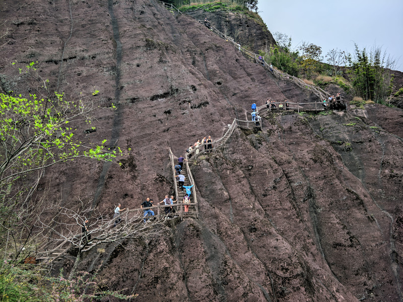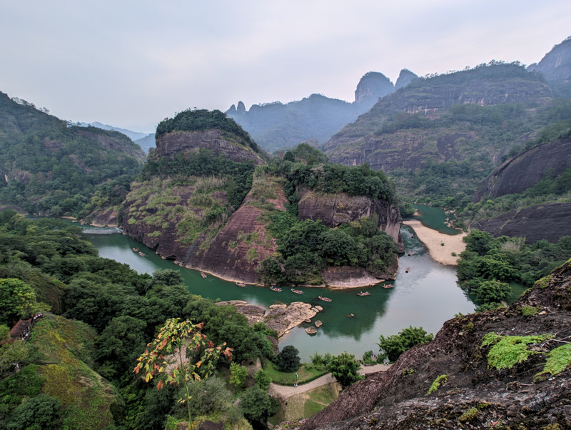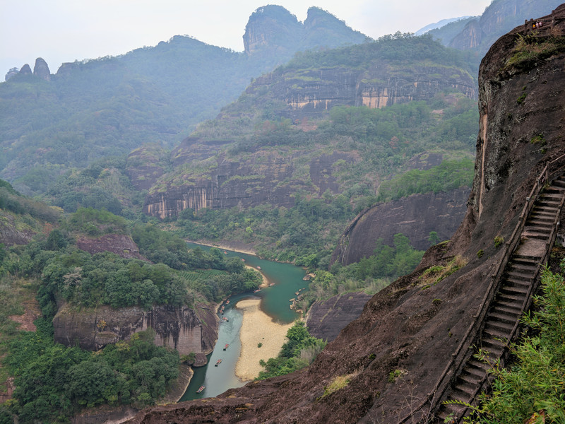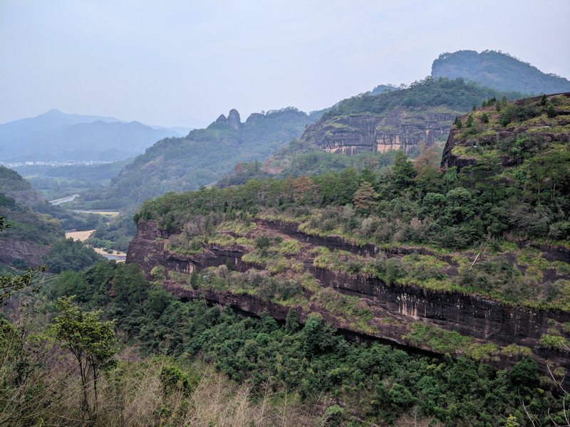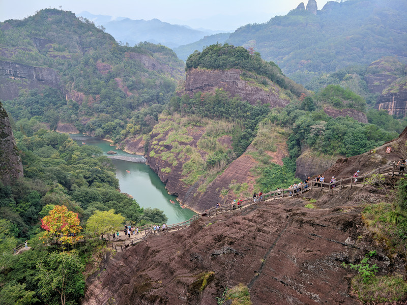 沿着山脊而上,两侧都是悬崖绝壁,个别地方的陡峭度接近七八十度,不过随着海拔的提升,脚下的九曲溪逐渐扩展,远处山脉连绵,山下溪流婉转,武夷山的精髓就在于此了。