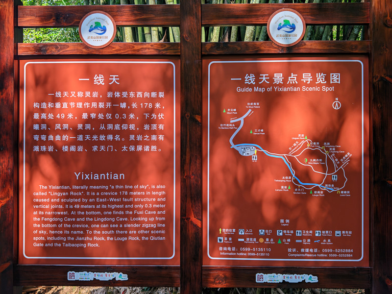 武夷山的一线天分为左一线天和右一线天。景区指示图应该是错的,左右一线天并不相通。右边的相对更窄,透过缝隙看天空更有一线天的趣味,人也更多,难度较大;左边的则较为宽松,相对来说也没什么特别值得称道的地方。