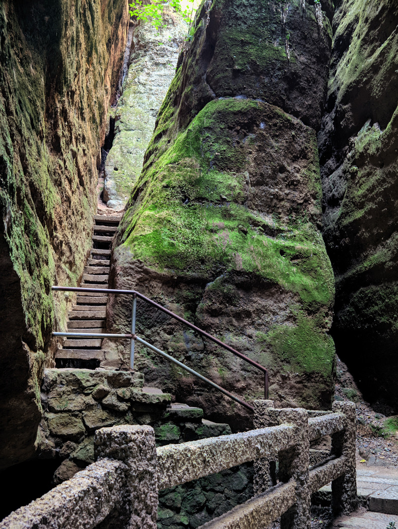 我先走左边一线天,入口处比较幽暗,需要开启手机照明,但走起来比较轻松,通道宽度基本够两人侧身而行,一个人行走,自然是毫无难度。很快就走到尽头,就这?前方是通往景区入口的道路,我坚决不走,原路返回一线天入口,转战右边一线天。