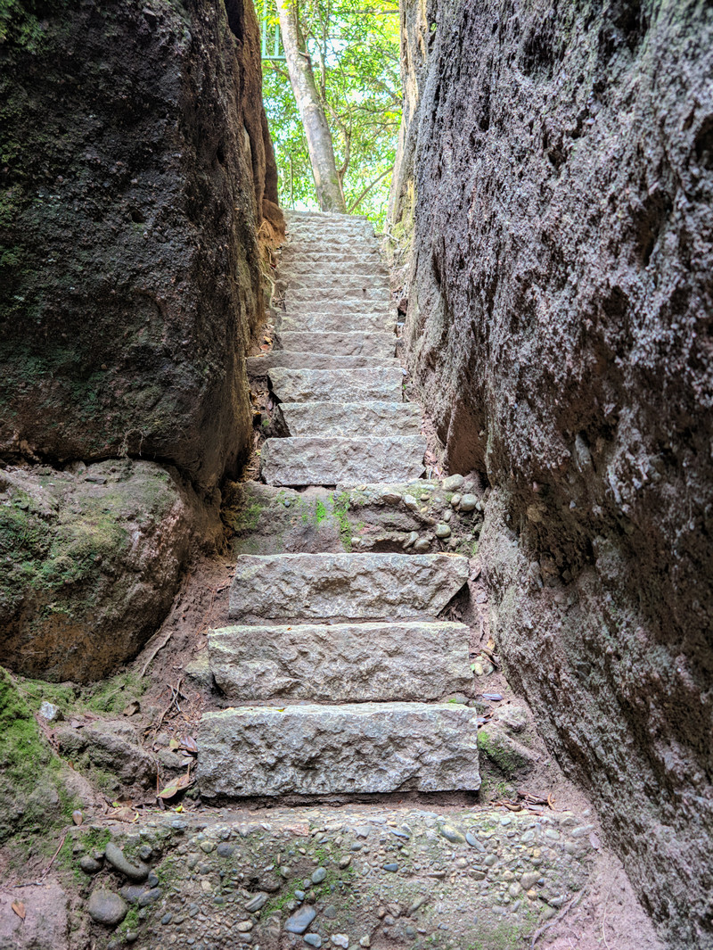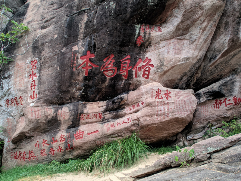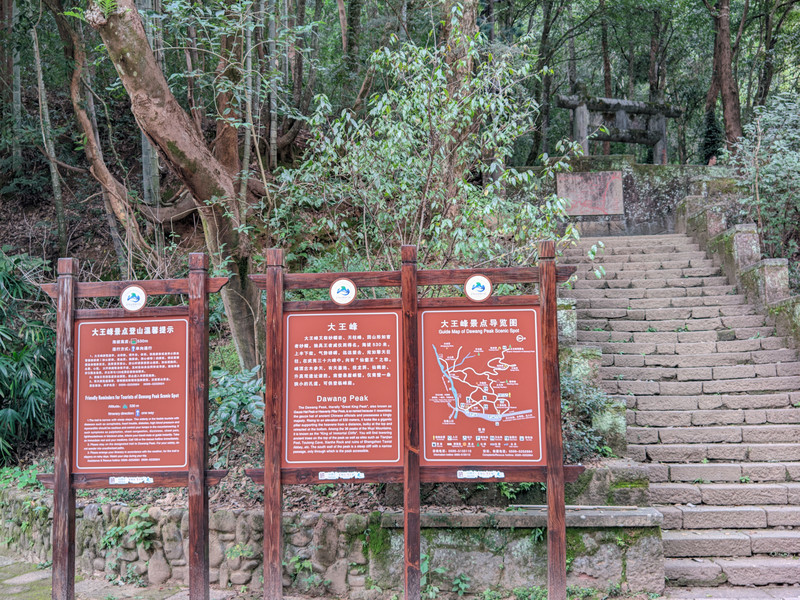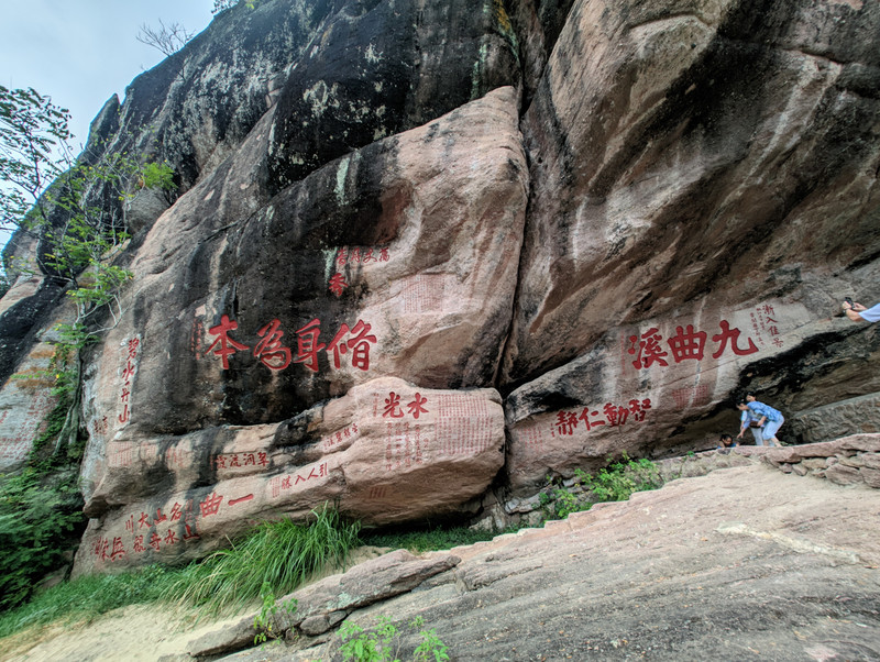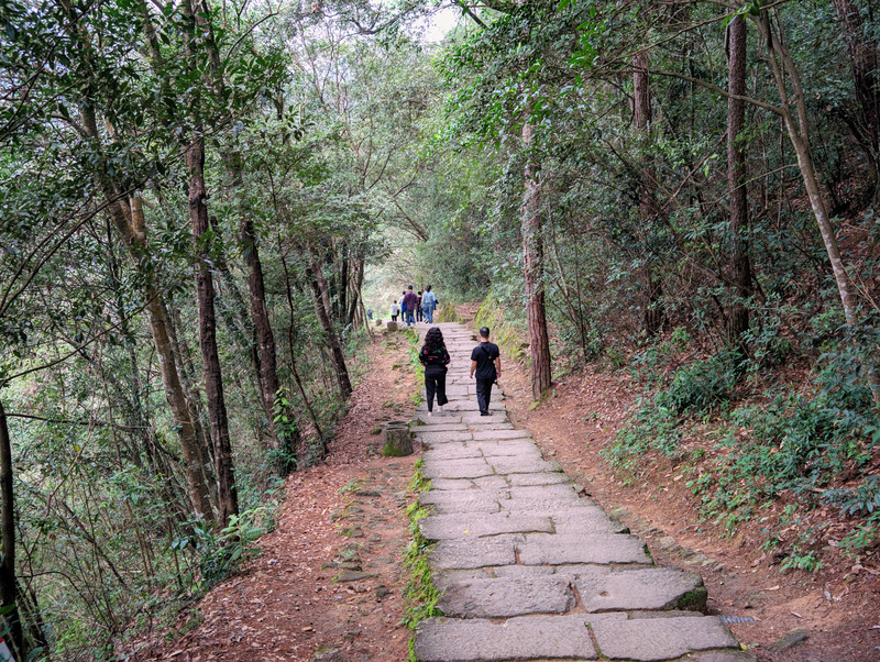 往桃源洞方向的路上只有2人,一路的阶梯有上升的,也有下降的,感觉不像是下山。前面的游人忽然向我问路,问的是九曲溪竹排起点星村怎么去,我晕,我还以为他熟悉道路负责带路的呢。利用我出发前准备的丰富知识,我热情向他指引路线,结果变成我在前面走,他在后面远远跟着,我要先带他下山。