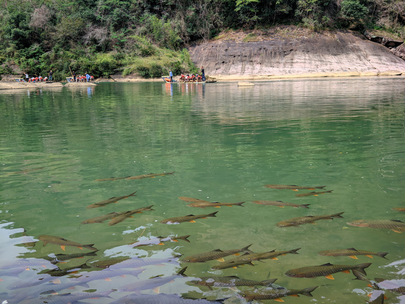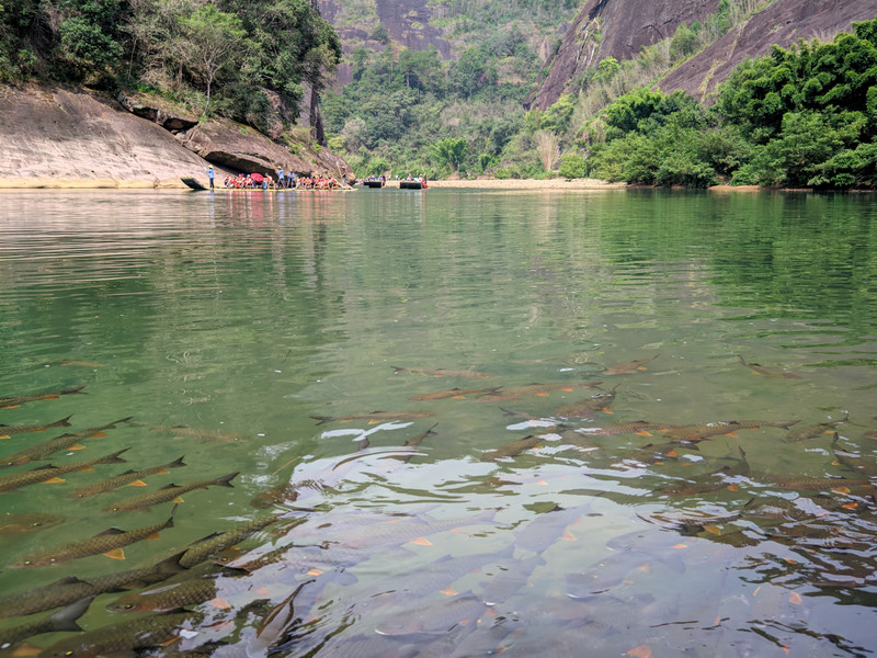 九曲溪在云窝有观鱼台,红眼鱼在水下游弋抢食,水上的竹筏漂流游客们谈笑风生,多么和谐的画面。