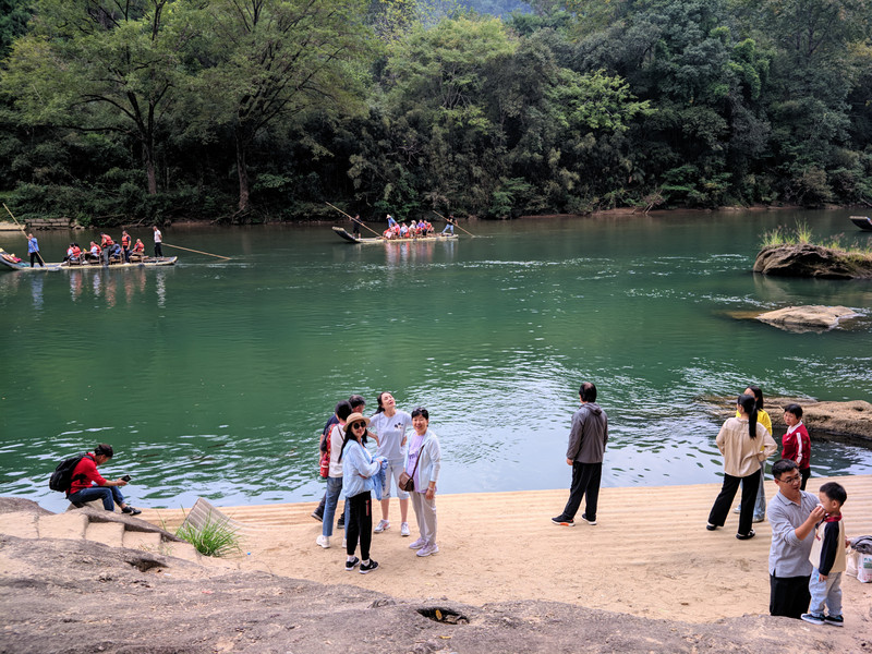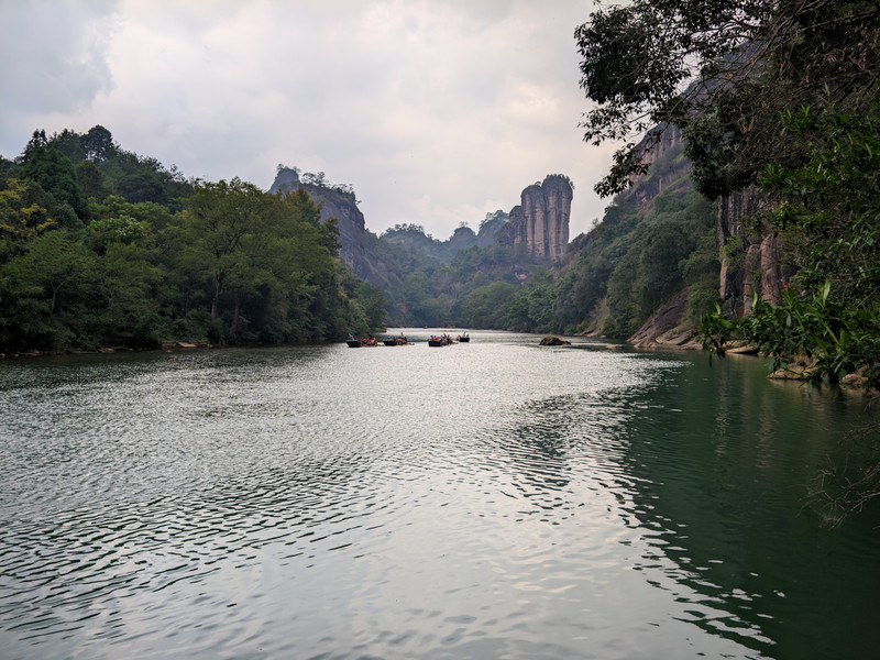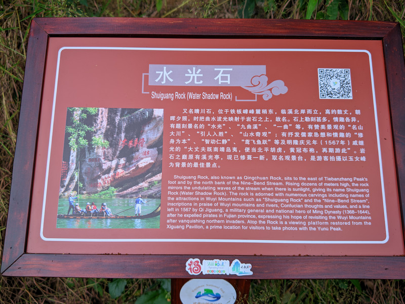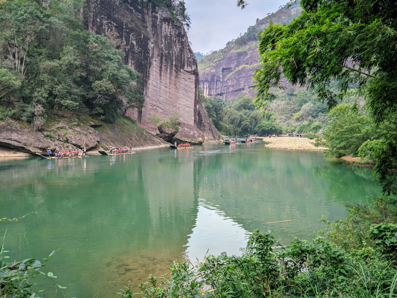 一路下行,来到九曲溪边,阳光偶尔穿过云层洒向武夷山,天气开始变好了。只见从溪边前往桃源洞的游客络绎不绝,他们才是掌握路线密码的大多数人,只是回去要走回头路。