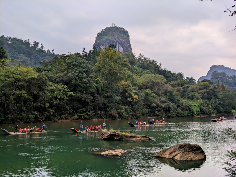 根据指示,我沿着九曲溪走回天游峰,这段是九曲溪漫游道的一部分,也是游人云集的一段。九曲溪上,竹排近距离连续经过,游人都是欢声笑语,快乐有时就是这么简单。
