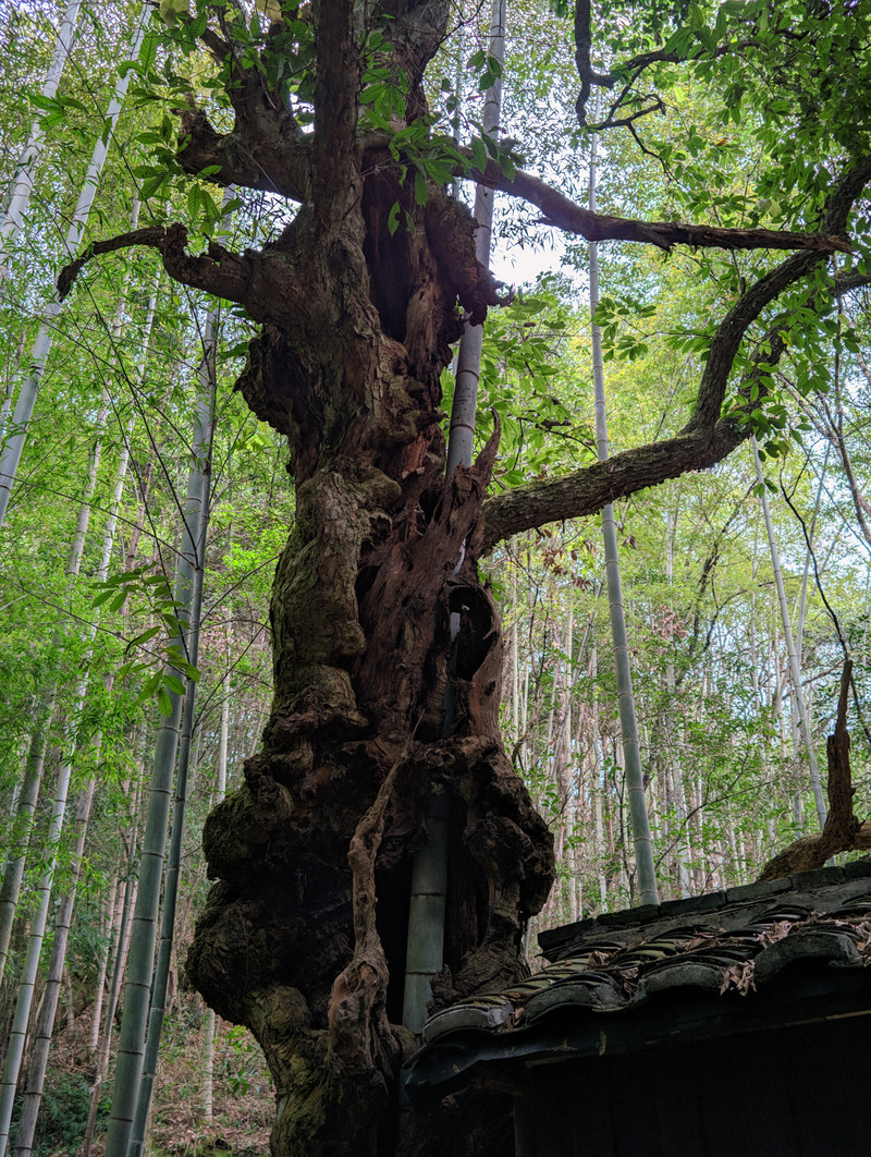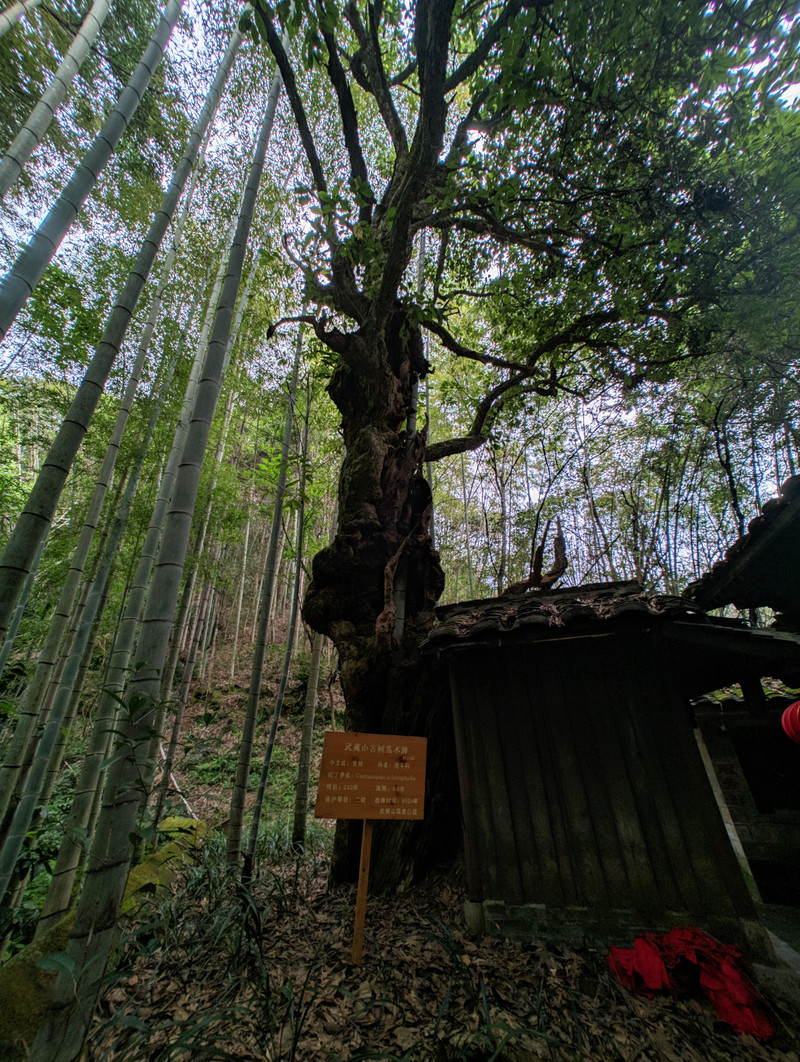 2015年,止止庵重修开放,有一竹笋从树根中间破土而出,笔直从朽空的树干中冲天而上,直插云霄。苦槠树中间朽空,应证了佛教所讲“苦、空、无常”的道理;竹有气有节,向来是儒家君子的象征。这就是山门后的“胸有成竹”奇观,跟三教合一又扯上了关系。