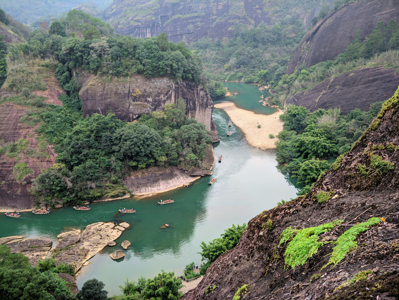 无限风光在险峰,随着海拔升高,眼前的风景也越来越美,很多武夷山的大片都是出自这里,最美的观景处就在九曲溪的第六曲处,从山上向下看去,蜿蜒的一条弧线,小小的竹筏排排划过,真是一幅画卷。这里也是武夷山的标志性打卡处,很多宣传片的内容都是出自这里。为了眼前这山水画卷,天游峰就值得多次来爬。