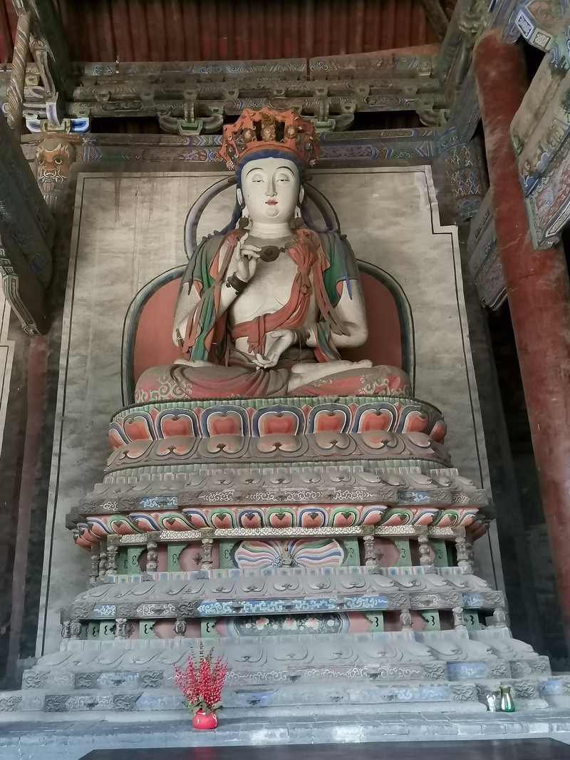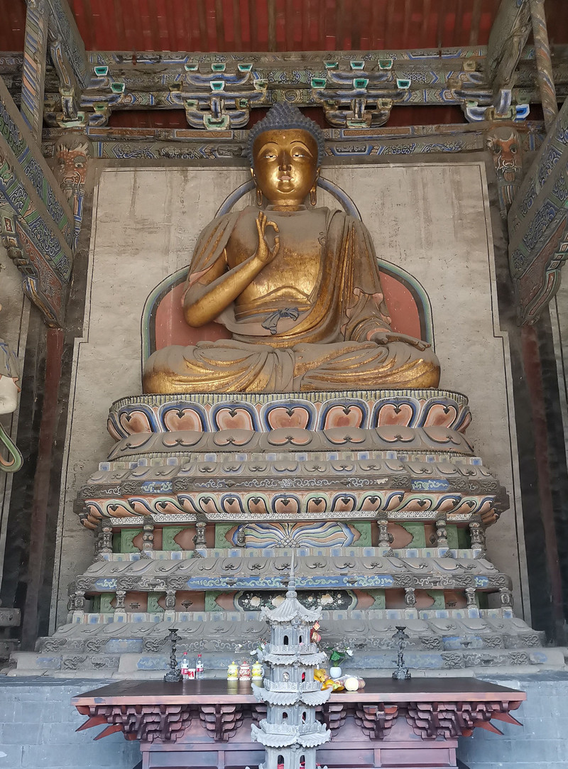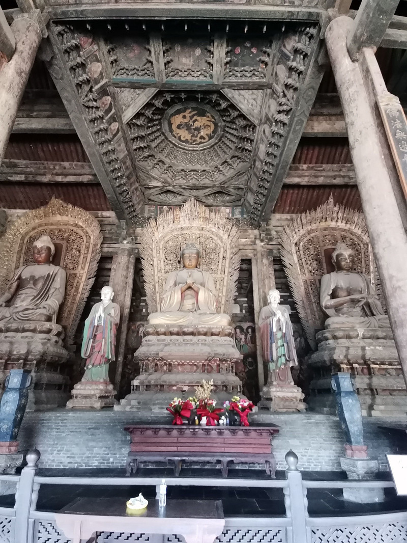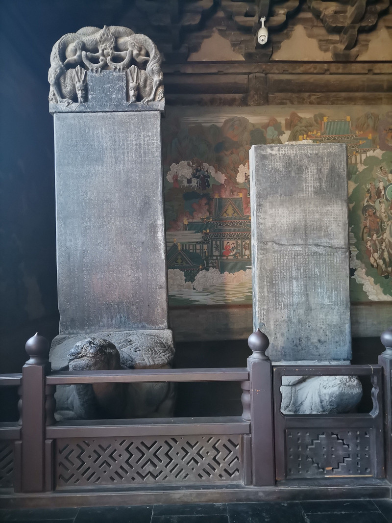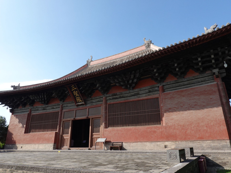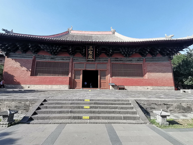 三圣殿,是善化寺中殿,殿内中央塑有“华严三圣”像。中为毗卢遮那佛,左为文殊菩萨,右为普贤菩萨。殿内还保存有金代的两通碑碣,其中金大定十六年的这一通为宋通问副使朱弁所撰,尤为珍贵。这通金碑不仅是珍贵的文物资料,而且也是难得的书法妙品。