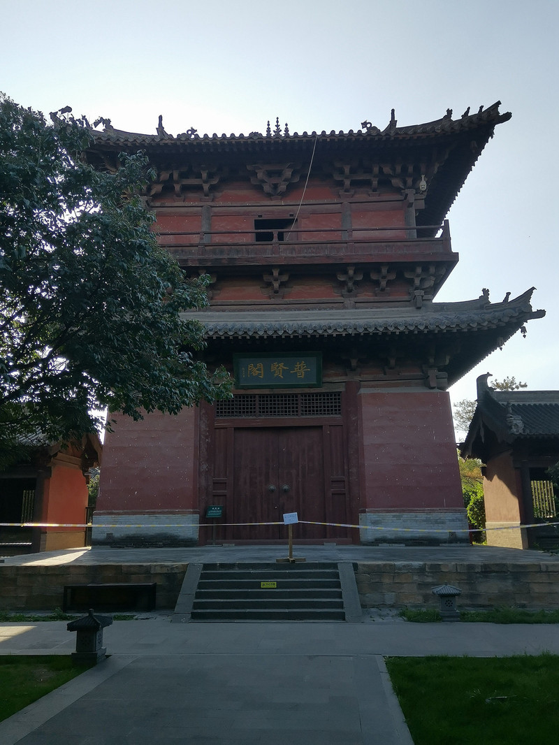 普贤阁位于大雄宝殿与三圣殿之间西侧,是一座重檐九脊顶楼阁建筑,平面方形,面阔、进深均为三间,总高18米,金贞元二年(1154年)重建,1953年曾落架重修。结构精巧,形制古朴。内有普贤菩萨骑象坐像,周壁绘制《普贤经变》壁画,根据普贤的故事而绘制的壁画。