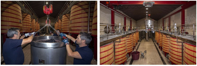 葡萄去梗后,经由传送带传送至贮存容器,然后再传送到发酵器皿内。酒庄至今仍保留着脚踩葡萄的酿酒传统。大家在发酵器皿内踩踏葡萄,充分萃取葡萄皮的颜色、单宁和其他风味物质。破皮后的葡萄和葡萄汁一同浸泡,