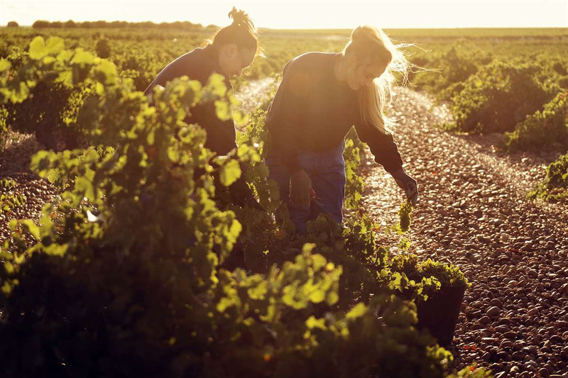 里奥哈产区(Rioja)的葡萄园里,员工们拿着剪刀和果篮,来回穿梭在翠绿藤间采摘果实。该葡萄园倚靠埃布罗河河畔,得天独厚的地理位置优势,孕育了富含多种元素的土壤环境,为种植优质的丹魄葡萄(Tempranillo)提供了良好的自然条件,同时也为酿制个性鲜明的上乘葡萄酒打下坚实基础。