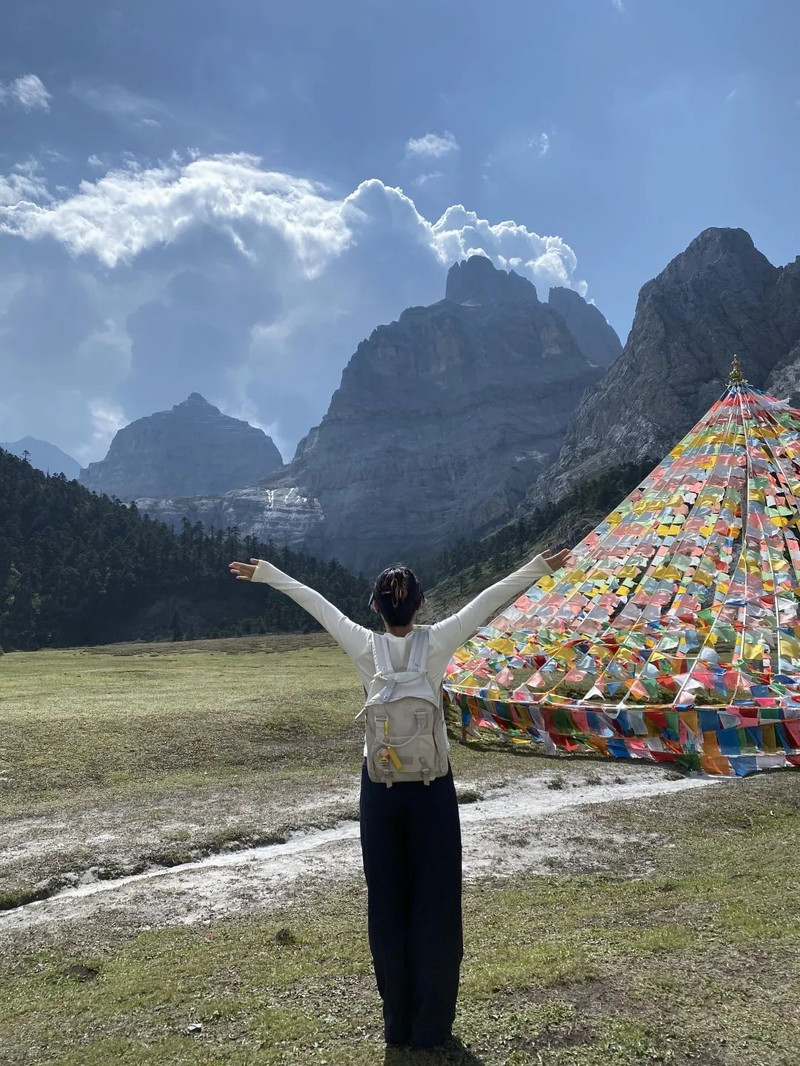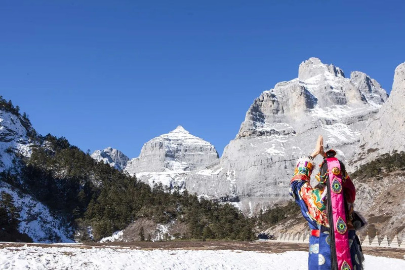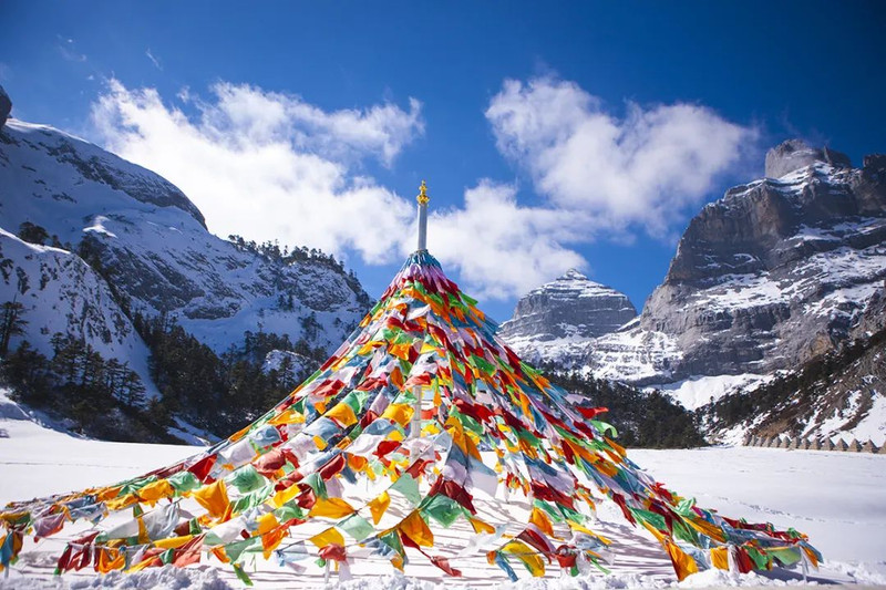 我们将自己从城市中抽离出来,把一切交给白茫茫的大地。离人群越远,离自己就越近。转过108道弯,天然佛塔撞进眼里。洁白的雪,变成了天上的云,抬头便向我徐徐涌来。洁白是它的外表,神圣是它的底色。看一次,便是双眼和灵魂的净化。谁都想留住这样的美景。不如来一张,让照片成为永恒。巍峨的香巴拉佛塔,山即是塔,塔即是山。这样的美景,就是这张照片最好的背景。