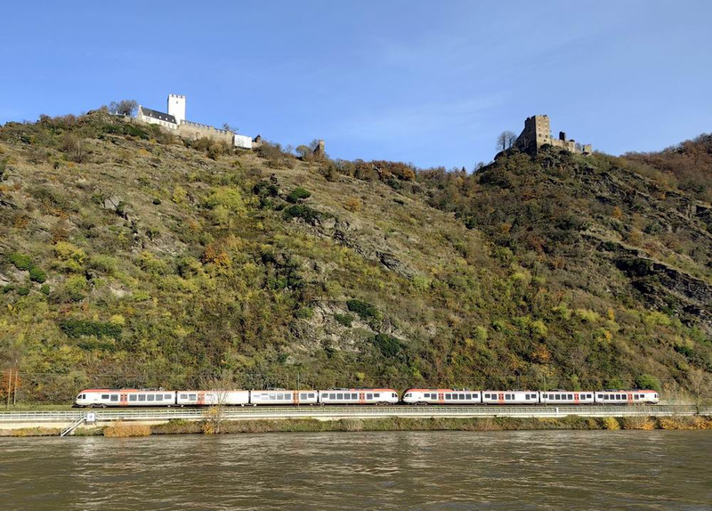 古老的城堡,和现代化的火车,竟然进入同一个画面!照片摄于莱茵河中段。
