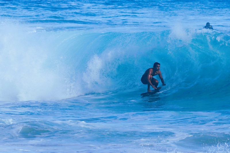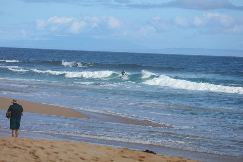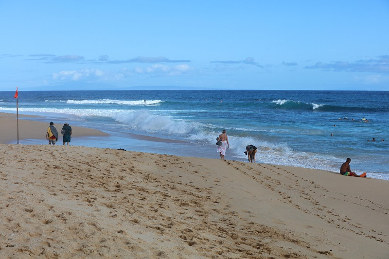 从Halona Blowhole Lookout前行约2-3分钟,到桑迪海滩Sandy Beach。桑迪海滩是冲浪胜地,设有停车场、厕所、更衣室以及淋浴设施,有一些稀疏的树可以遮阴。我们将车停下,在海滩上欣赏冲浪。一人多高的卷筒浪频频拍打沙滩,这才叫后浪把前浪拍在沙滩上。桑迪海滩的海浪比较大,可看到冲浪者在冲浪。有的游泳者站在海里,迎着高大的海浪,腾空跳起跃进海浪,勇猛果敢。