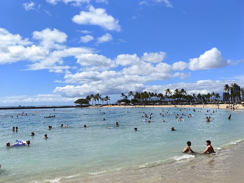 我们定的是14点的时间,要求提前半小时到达,实际也不用太早。在码头等待时候,可以欣赏两边的海滩,透明见底的海水波浪起伏,近处呈现碧绿色,向远处逐渐过渡成深蓝色,远处海浪一道道掀起,不少冲浪者在海浪间穿梭冲浪,令人羡慕不已。不久,一艘轮船驶来,水手迅速用缆绳系住轮船,熟练帅气的手法吸引了大家的目光。船有两层,下层在室内有排排座椅,二层是室外,视野开阔。船启动后,我顺着楼梯来到二层,船缓缓离开码头向大海深处驶去。碧绿的海水中一只海龟浮到海面上,从轮船边划过。轮船晃动着经过道道波浪,全速驶离海岸。威基基海滩的层次感逐渐显现,天上白云朵朵,远处层层山峦,中间高楼大厦,近处椰林海滩,浅滩上游客戏水,美景如画。
