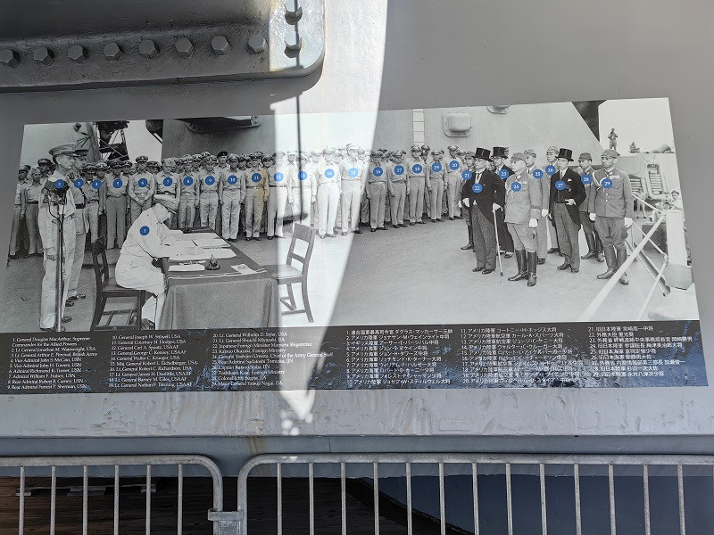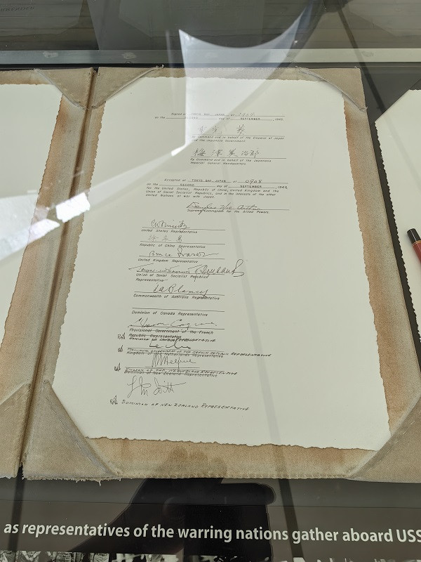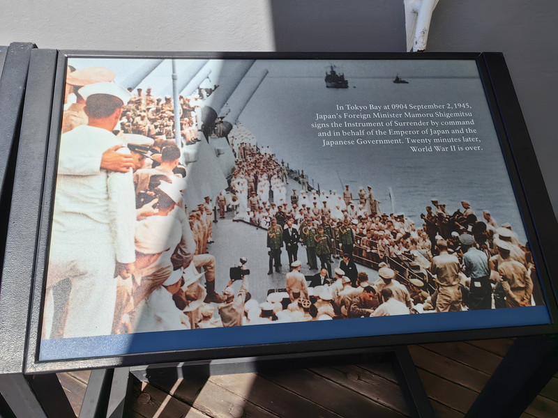 大巴驶出游客中心,过桥前往福特岛,巴士通过福特岛的海军基地时,游客不可以拍照或视频拍摄。巴士抵达密苏里号战舰纪念馆后,游客下车,验票后依次登船。那天参观的人不算多,一位操着南方口音的中文导游带领我们三人游览战舰。他带领我们游览了一层甲板,介绍了舰首尾的大炮、为何铺设木质甲板等,重点介绍了当年日本签署无条件投降书的情况和签字地,还介绍了二战期间一架日本战机撞击甲板事件。将近一小时的介绍,让我们了解了那段历史和传奇故事。谢过导游后,我们进入内部游览一番。而后,又乘坐大巴经过航空馆后回到游客中心,购买了纪念品后驱车返回酒店。