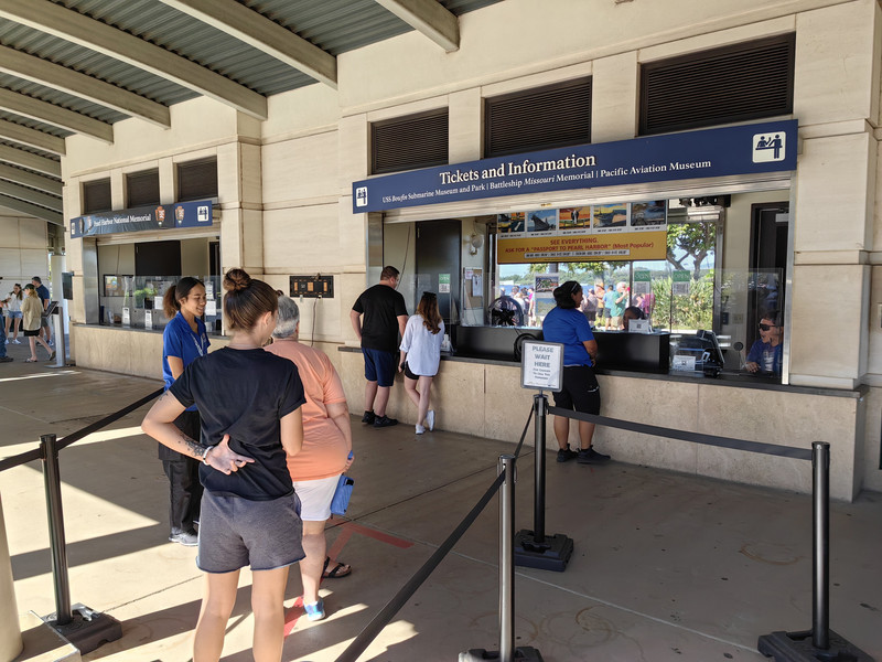 门洞右面两个窗口,左边购买珍珠港纪念馆门票窗口,右边是购买波芬号潜艇博物馆、密苏里号战舰纪念馆、太平洋航空博物馆门票。密苏里号战舰门票每人37.44美元,要乘坐大巴车到福特岛登舰。巴士站位于珍珠港游客中心内,购票后右转直走,就可见到接驳巴士站候车处(Shuttle)。游客凭票免费接驳巴士,前往福特岛的密苏里号战舰纪念馆。