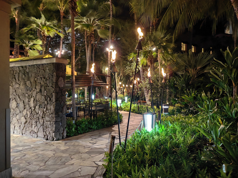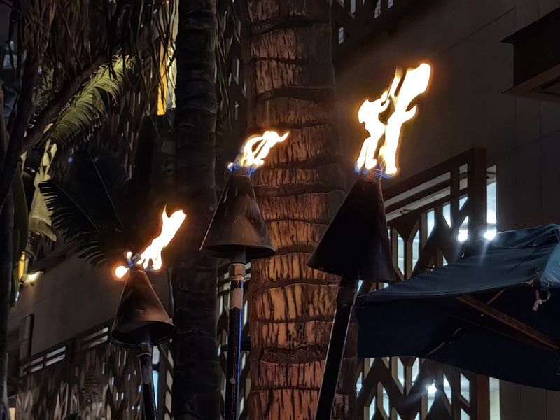 然后从潜艇回到游轮,返回码头。返回后,沿威基基海滩闲逛,游逛卡拉卡瓦大道。卡拉卡瓦大道上各种商店、餐馆、酒吧、酒店林立,晚上人很多,来来往往,还有白天看不见的卖艺的,在路边吆喝。人多路不宽,但又很有秩序,不时看见闪着蓝色警灯的警车疾驰而过。路两旁一排排椰树之间,树立着一人多高的杆子,但上面不是灯,而是火把,不太懂。