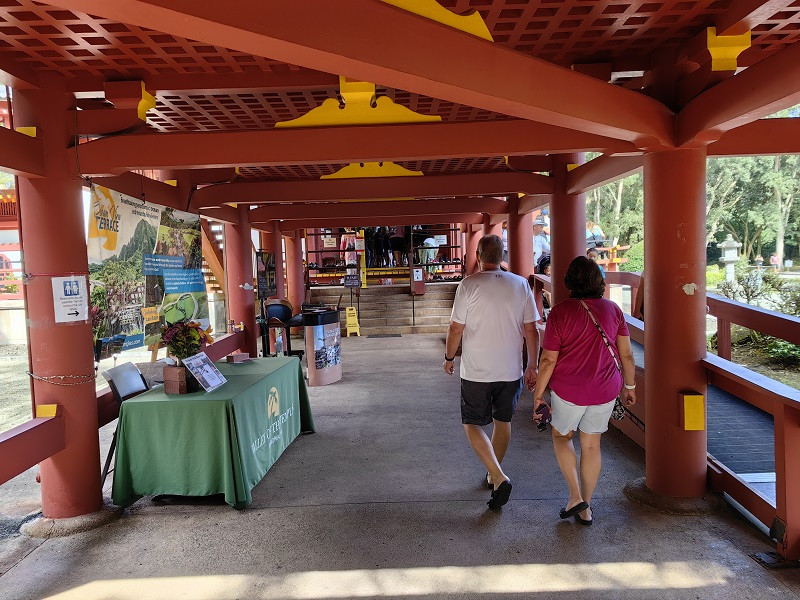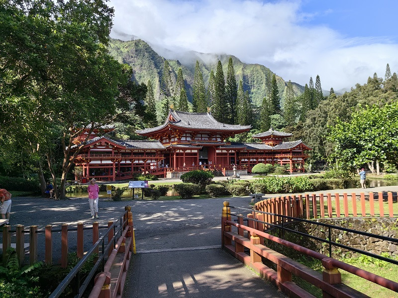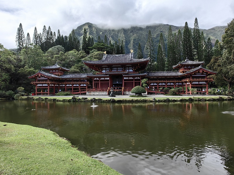 平等院The Byodo-In Temple,又叫神庙谷Valley of the Temples,位于柯劳山脉翠绿的山谷中,是许多夏威夷人的安息之处。这是一座日本佛寺,Byodo-In译为“平等院”。佛寺建于1968年,主要是为纪念夏威夷的第一批日本移民登岛一百周年而建。寺院的风格是仿制日本京都府佛寺,整个佛寺从上到下没有一颗钉子,设计完美。