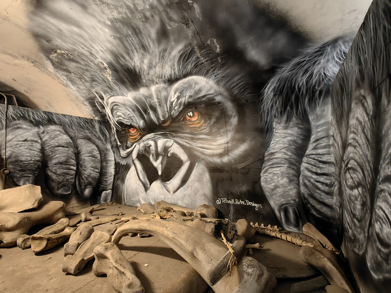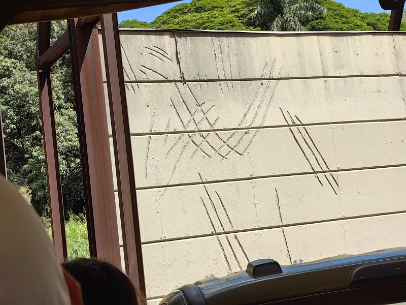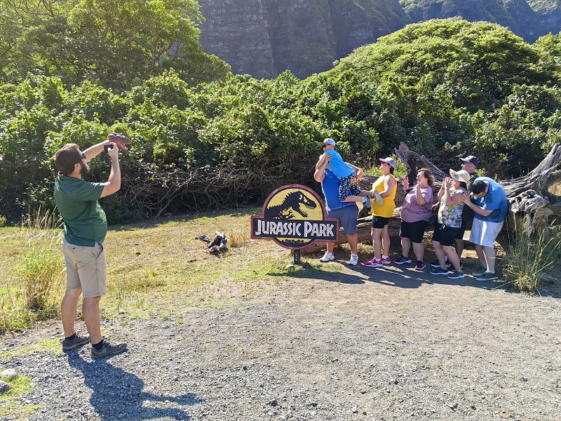 接下来,汽车到侏罗纪电影拍摄过的地方都停下来,讲解当时情景,给众人拍照留念。在侏罗纪公园第一集中,有格兰特博士带着两个孩子在草原上奔跑,躲到一棵躺着的枯树边的场景。驾驶员让一家人站在枯树前,做出恐惧的姿态,他则左手套着恐龙头,右手持手机拍照,很有意思。车子时而在山谷中行进,时而盘上山坡,一路土道,看到许多拍摄地。