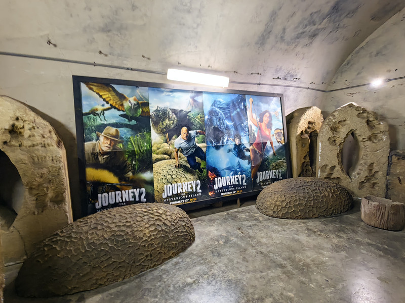 车进入树林行驶,不远处有一队人骑马前行,悠悠哉哉。车到半山坡一处废弃工事隧洞前停下,隧洞里是二战留下的许多物品,包括日本兵的用品,还有许多在这里拍过的影视片招贴画,一些实物场景。走出洞外,驾驶员给坐进一辆没窗户的车上的人们拍照。洞外公路美景如画,下面沿海公路曲曲折折,不同颜色的大海和朵朵白云交相辉映。众人纷纷留影,一队ATV车队过来,驾驶员和乘客们都蒙着面(许多路面是土路),犹如盗贼,缓慢而过。