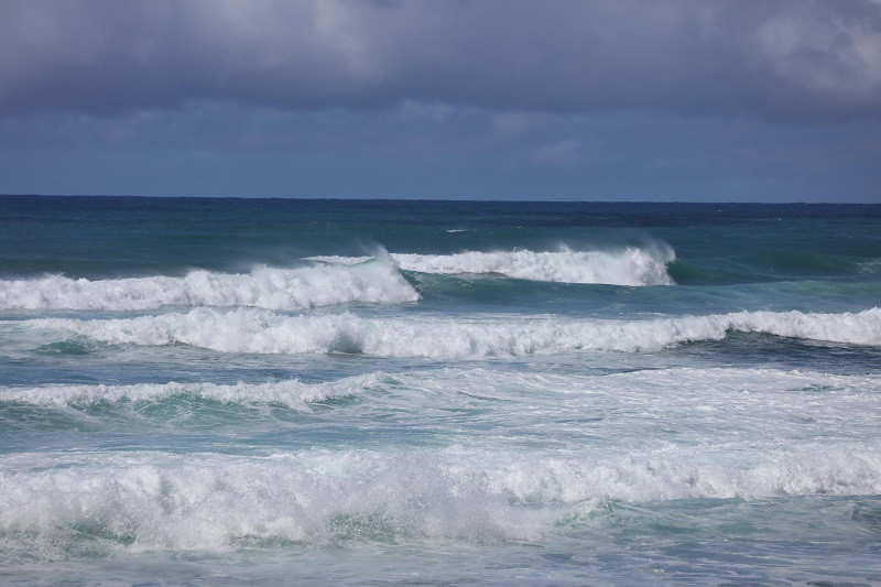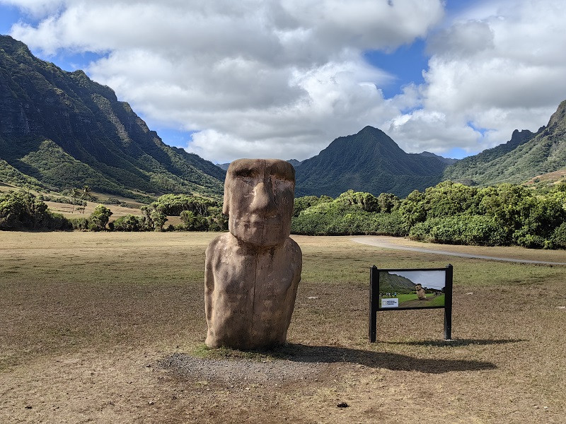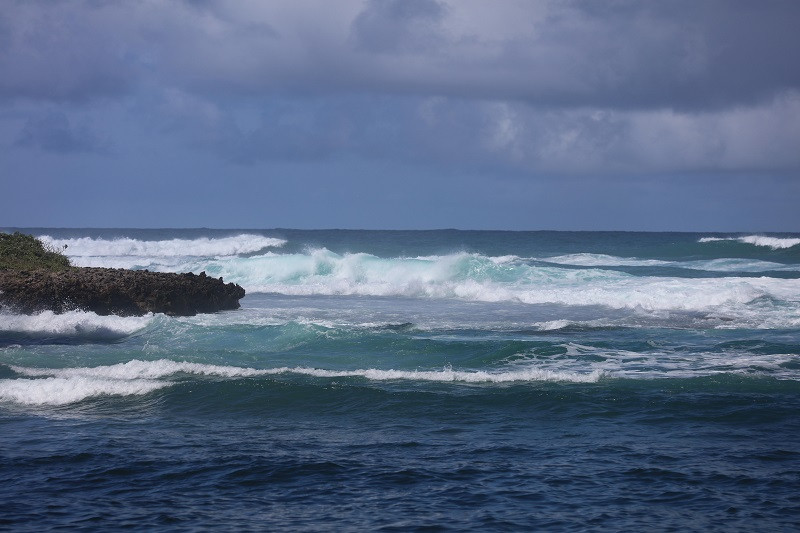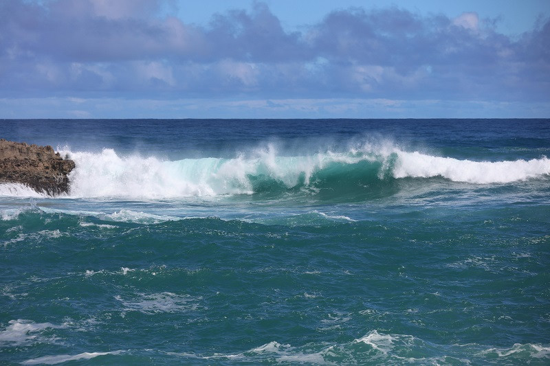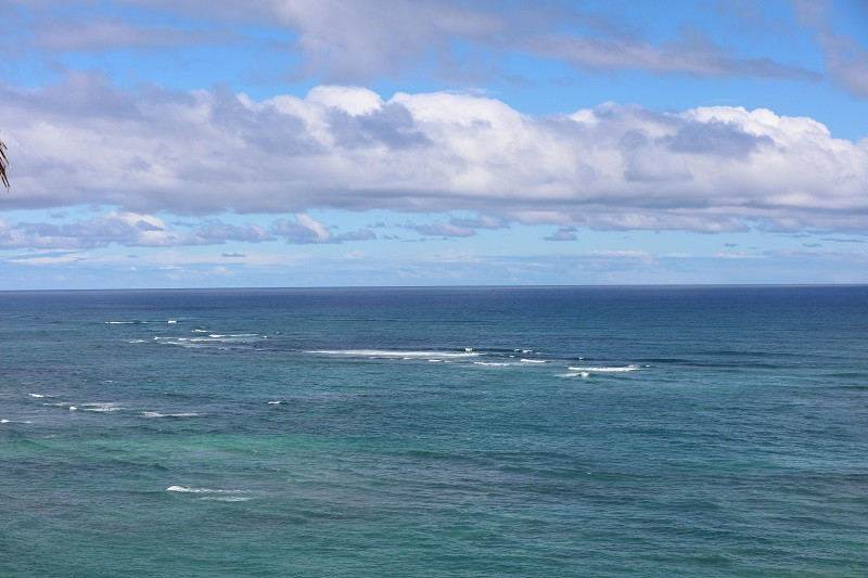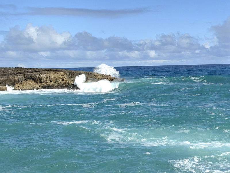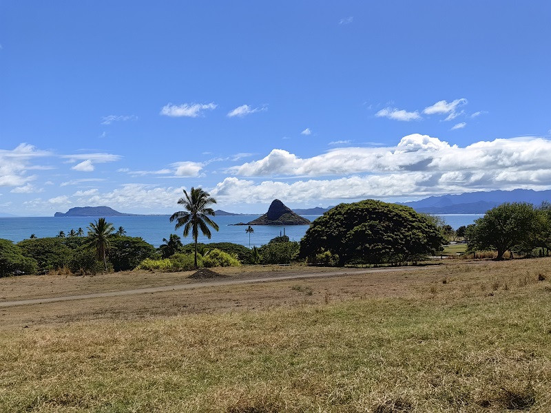 在此停留了十多分钟,我们前往拉耶点Laie Point。大约34公里,车程五十多分钟。一路向北,路过古兰尼牧场,右手海上有一个像斗篷的小岛,是著名的Mokoli'i,又叫中国帽子岛。这一段公路一直沿海,风景秀美,随便一照就是明信片风景。海浪都很大,一般在海边都说风浪挺大,这里确是风不大,浪大。海浪拍打着海岸,浪花扑向公路,有车经过就会打在车身上。大约十一点,到达拉耶,左手看到拉耶购物中心(Laie Shopping Center)后,在的路口转入Anemoku St再转入Naupaka St,直行至道路尽头,就到了拉耶点。