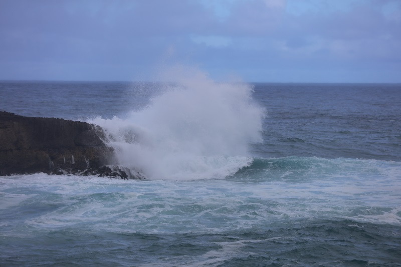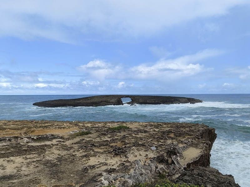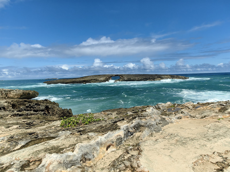 这里有几辆车,可以沿礁石向里走,虽然是蓝天白云,海浪却汹涌澎湃,拍打礁岸激起阵阵浪花。远处有一个岛,中心空洞,像一个门洞,经历着滚滚海浪。