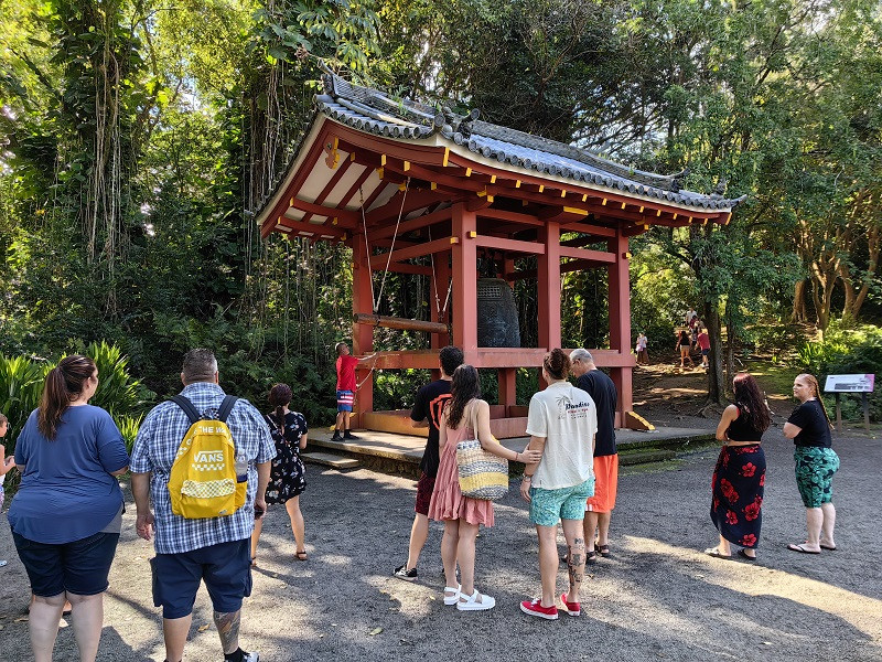 走过小桥,听到阵阵钟声,原来有一些游客在敲一口大钟,我们也排队敲了几下。寺庙整体红色基调,木质结构,寺前是一个不大的湖,湖里有大群锦鲤争食,湖面几只天鹅、鸳鸯在游动。