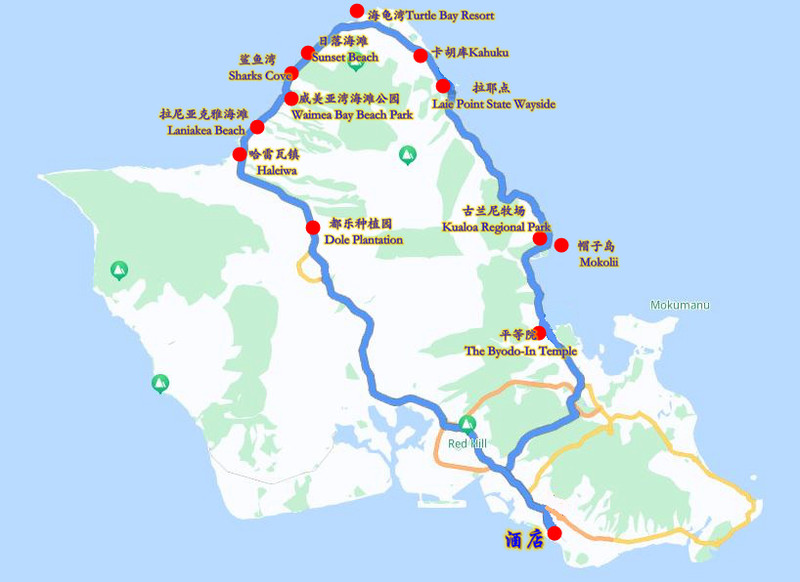 酒店—平等院The Byodo-In Temple—古兰尼牧场Kualoa Regional Park—拉耶点Laie Point State Wayside—卡胡库Kahuku—海龟湾Turtle Bay Resort—日落海滩Sunset Beach—鲨鱼湾Sharks Cove—威美亚湾海滩公园Waimea Bay Beach Park—拉尼亚克雅海滩Laniakea Beach—哈雷瓦镇Haleiwa—都乐种植园Dole Plantation——酒店