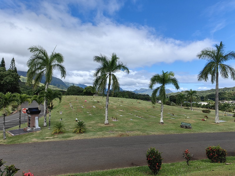 沿公路行驶,大约九点半,看见Valley of the Temples的牌子,左转开入小路之后,朝着大山开去,道路起起伏伏,两旁是大片齐整的草坪,上面点缀着簇簇鲜花,这就是墓,墓碑都镶嵌在草地上。大约行驶六七百米,左侧坡上可看见张学良赵一荻墓,墓前,有鲜花,还有一瓶汾酒,回去一查2001年10月14日是去世日期,今天是10月20日,有人曾前来祭拜。再行驶三四百米到达平等院停车场。门票,每人5美元。当时告诉三人,只收了10美元,一问,回答说进去吧,一副我说了算的样子。