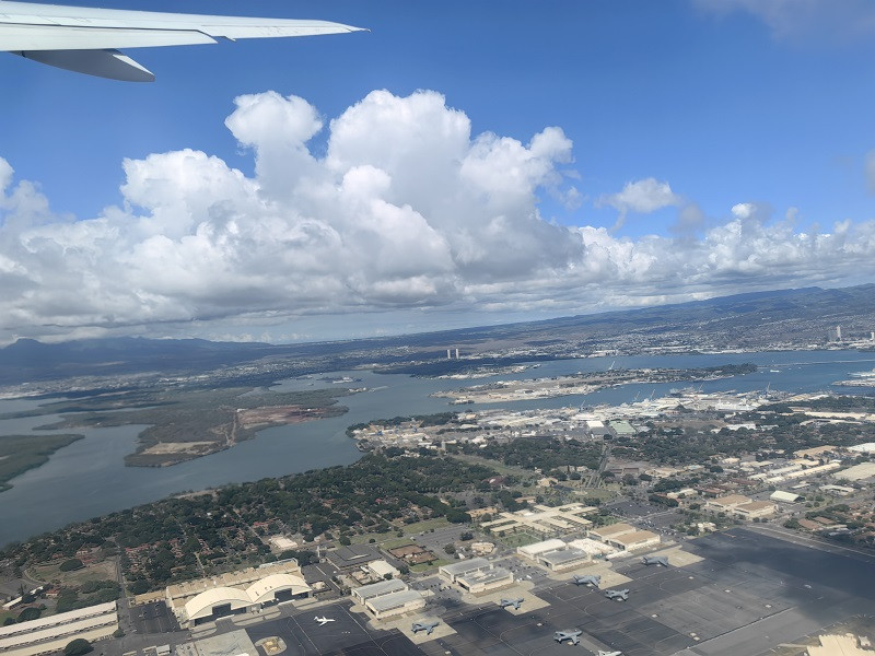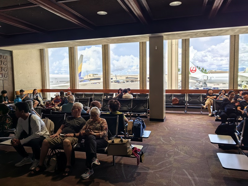 乘OZ231航班,火奴鲁鲁机场T2—仁川机场T1,11:50—17:10(10h20m),实际12:10飞,23日16:49到达。时差关系,下飞机就进入10月23日了。