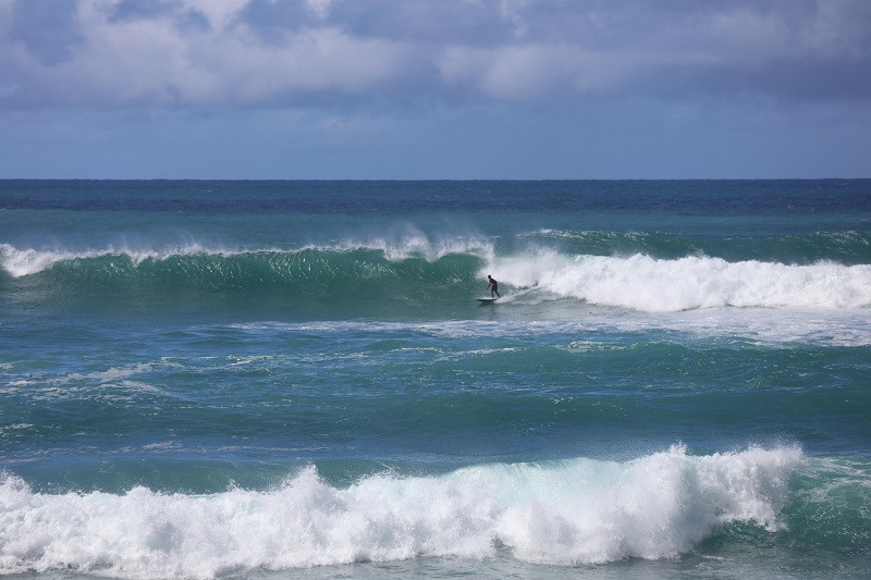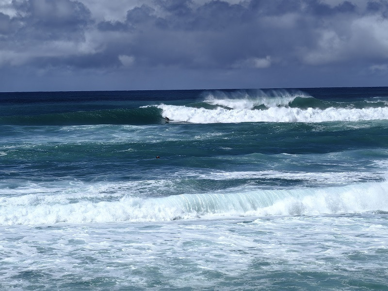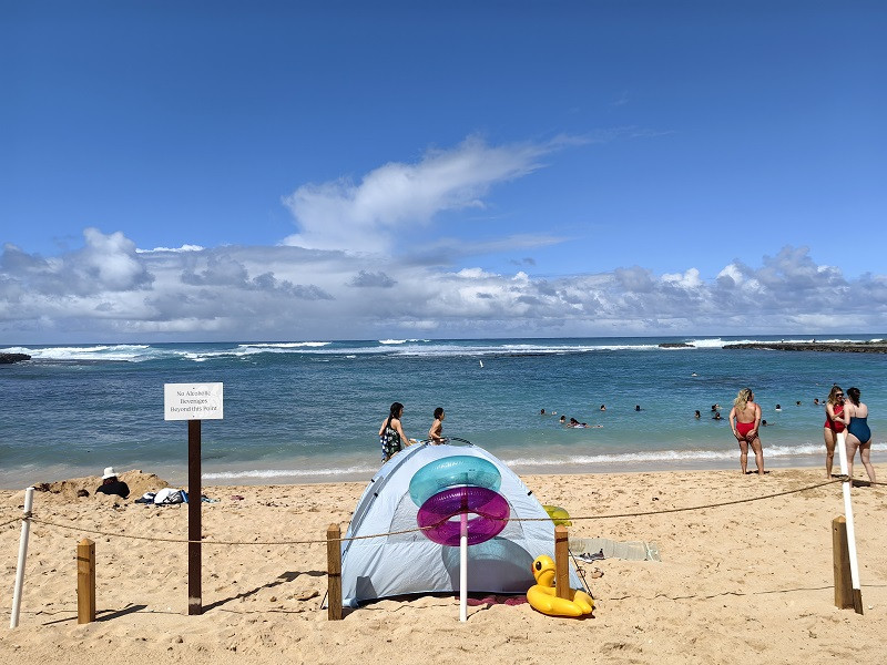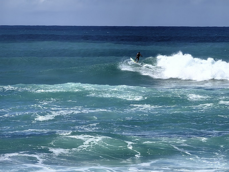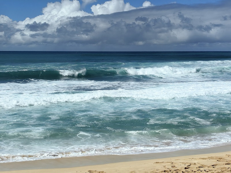 由此向前依次有日落海滩Sunset Beach、鲨鱼湾Sharks Cove、威美亚湾海滩公园Waimea Bay Beach Park、拉尼亚克雅海滩Laniakea Beach等,都是当地知名的冲浪者的天堂、潜水者的胜地,海水清澈、景色怡人,游客众多。各地之间相距几英里,车程不超过10分钟。海滩都差不多,我们有选择的稍作停留,即前往哈雷瓦镇Haleiwa。