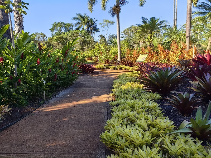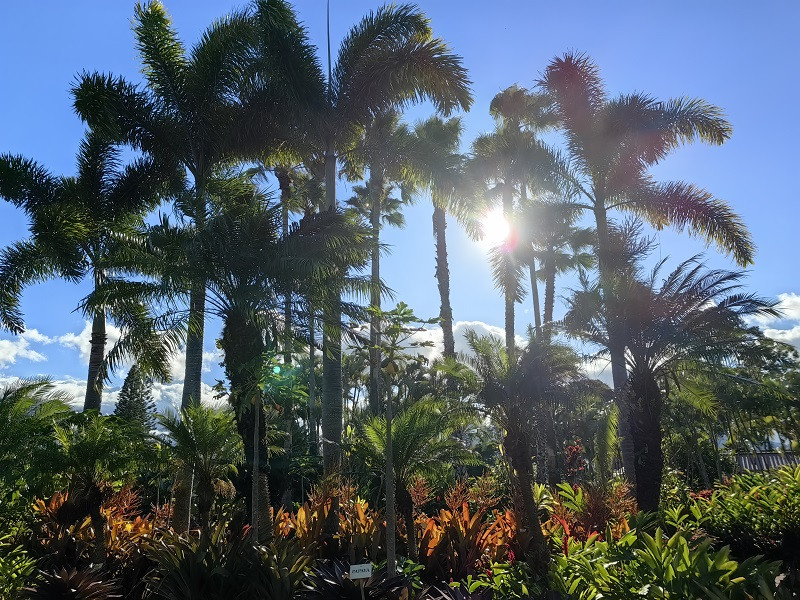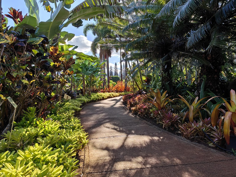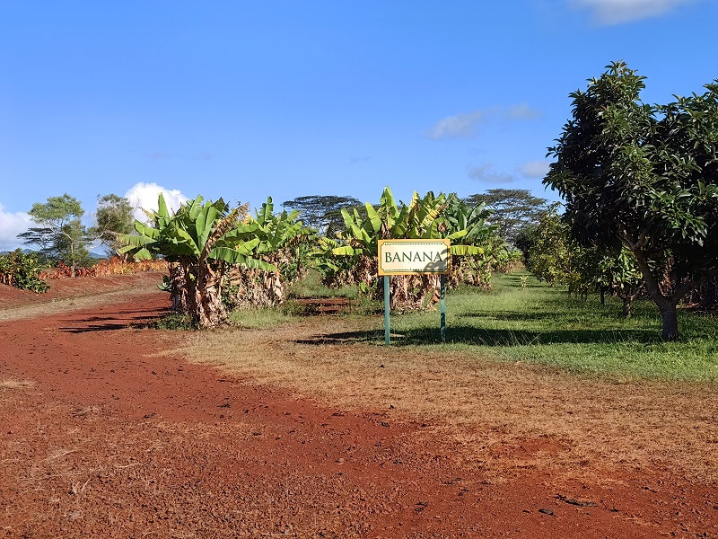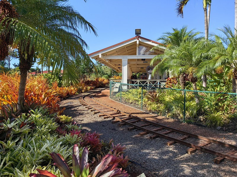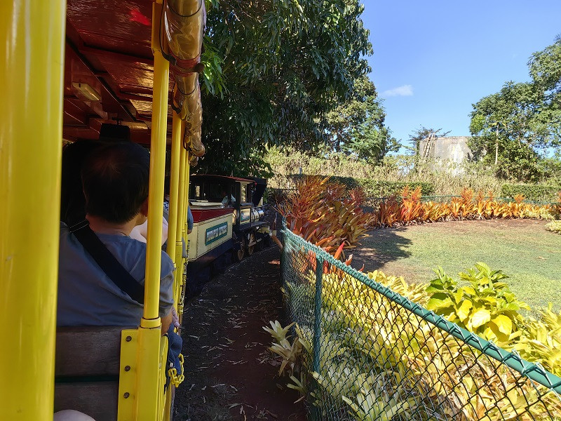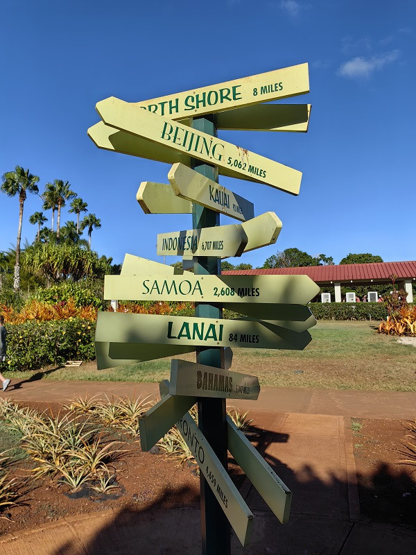 进门大屋子是商店,穿过去到屋外,右边走,有一个小亭子卖票,我们买的是小火车和植物园联票,三人58.9美元。小火车在种植园里走一圈,看见许多植物,都标着名称,一圈大约30分钟,也算是一种体验。植物园很小,也是各种植物标着名称,迷宫没去。看见一个国际各大城市指示牌,此地距北京5062英里(8099公里)。在商店里买了菠萝冰淇淋,挺好吃。