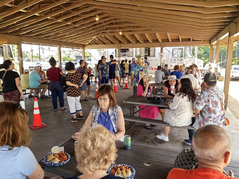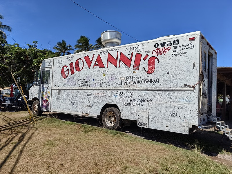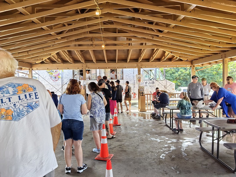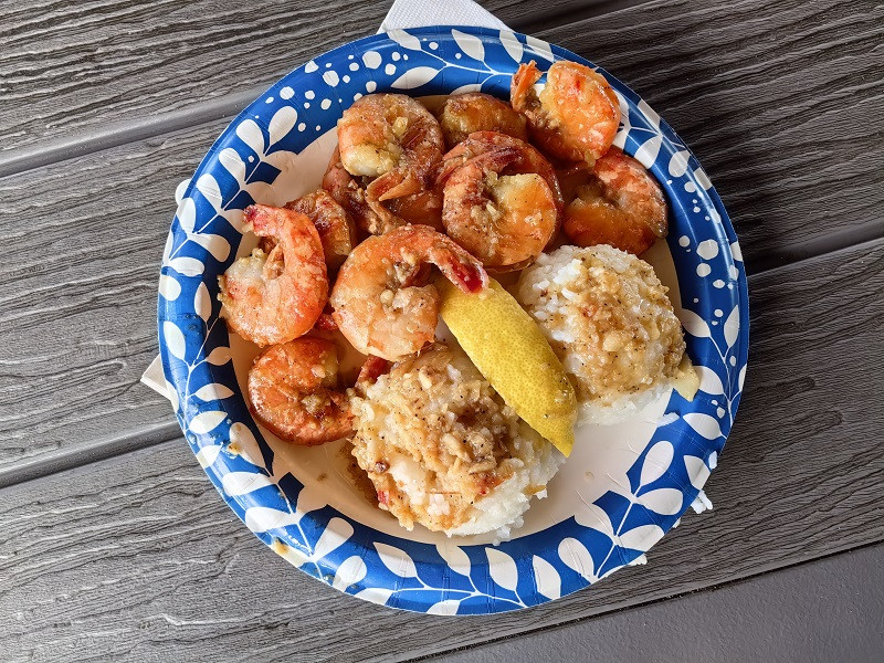 在这里吃有名的奶油虾,就是一个餐车。一辆有很明显的Giovanni's Shrimp的标记餐车停在路边,背向公路的一面有售卖窗口,有一个棚子,里面许多桌椅,大家在此用餐。在卖奶油虾的餐车附近还有很多别的餐车,大家都是因为奶油虾慕名前往,主打是虾饭。Giovanni's Shrimp的餐车人最多,排一小会儿队,虾饭一份16美元,只能支付现金。一个碟子上几个饭团和十多个虾,个人感觉味道一般吧,比较新鲜,就是网红。大家用餐后都自觉的将碟子、纸巾放入垃圾桶中,虽然人来人往,桌面干干净净。