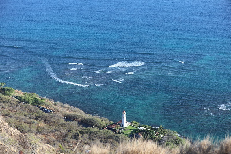 钻石头山Diamond Head State Monument位于欧胡岛威基基海滩东南海岸,夏威夷最知名的地标,以其历史悠久的徒步旅行路线、迷人的海岸景色和军事历史而闻名。这个宽阔的蝶形火山口形成于大约30万年前,喷发的火山灰和细微颗粒降落下来形成凝灰岩,在公园小径上可以看到。山顶可见碉堡,和山下灯塔以及整个威基基海滩、城市,360度饱览海景、山景、城市景观。