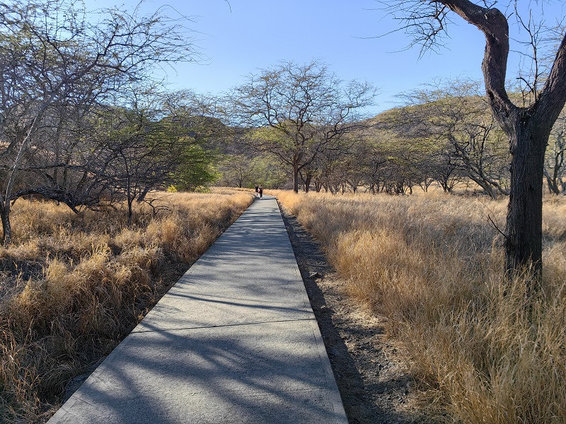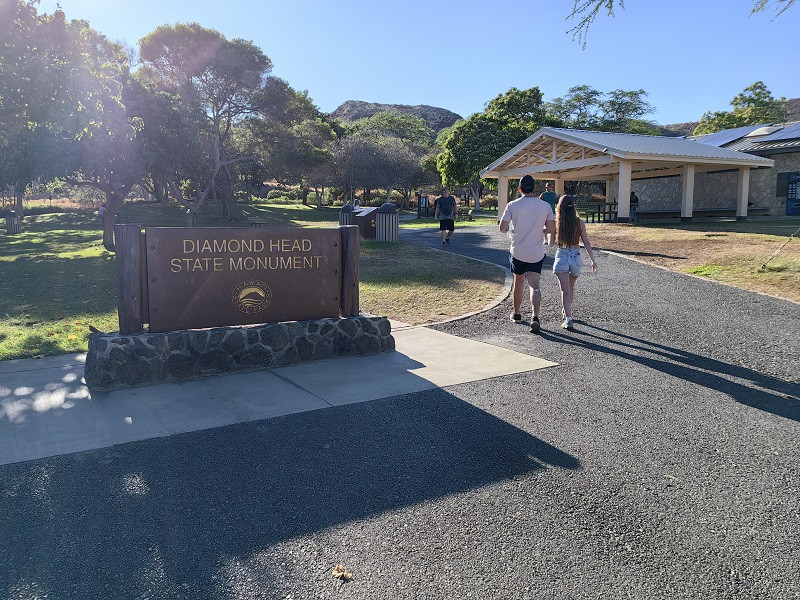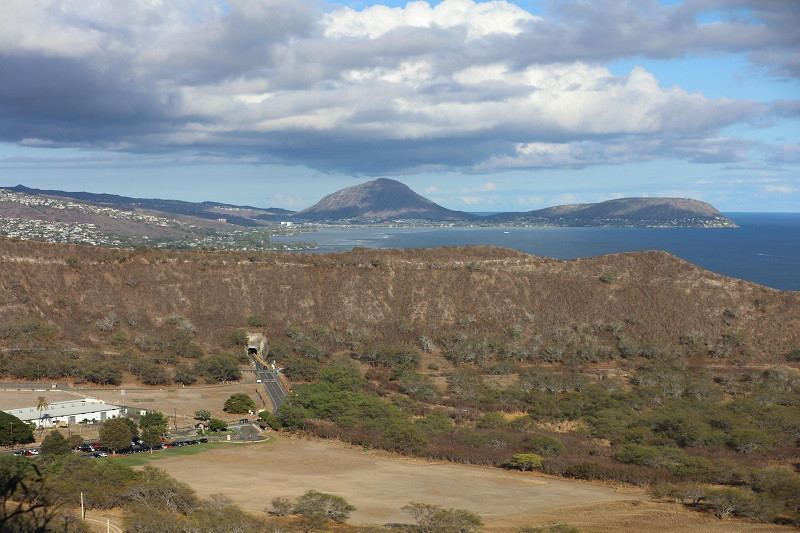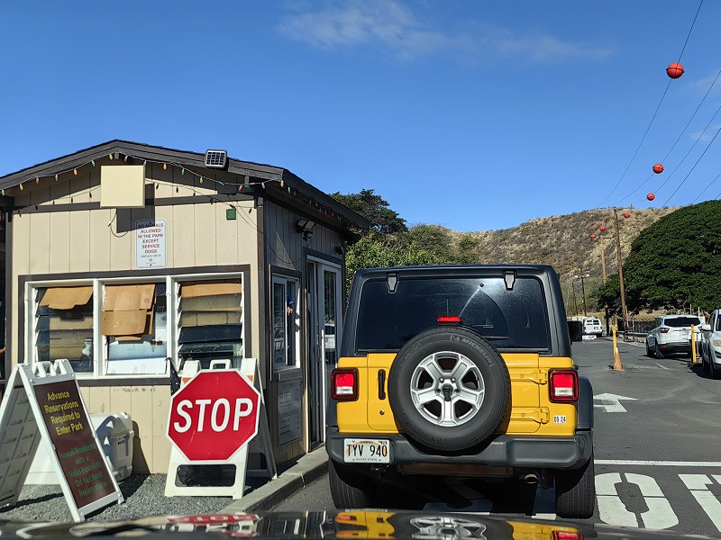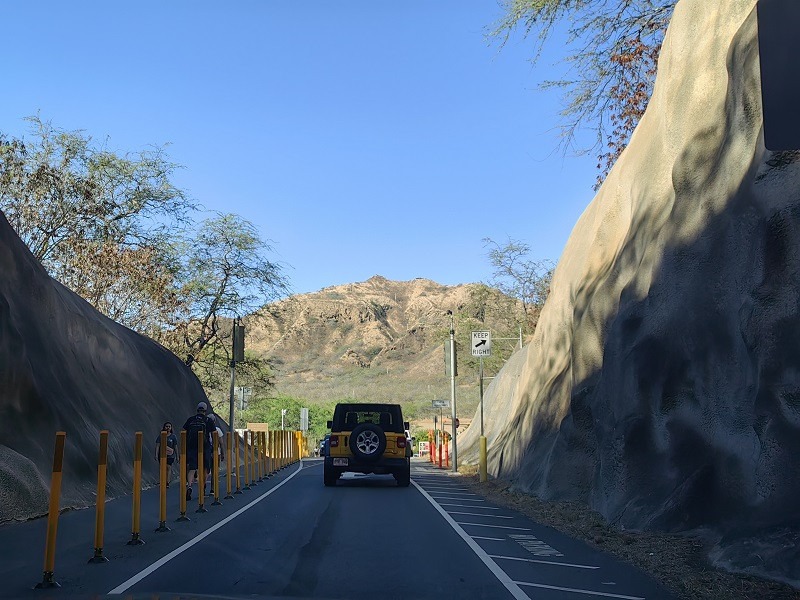 8:00出发,前往钻石头山停车场,3.3英里(5.3公里),车程17分钟。从主路右转进入小路,不久看见隧道,左侧是一个小型停车场(八九个车位)和一个观景台Kahala Lookout,经过隧道进入钻石头山的火山口内,隧道口有红绿灯,实行单向通行。进入停车场前,需交费,才知道,游览钻石头山要提前预约。只好掉头出来,因为要去阿拉莫阿那中心,就在手机上约的下午4点到6点。