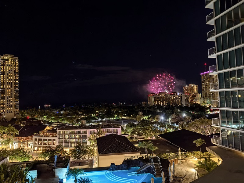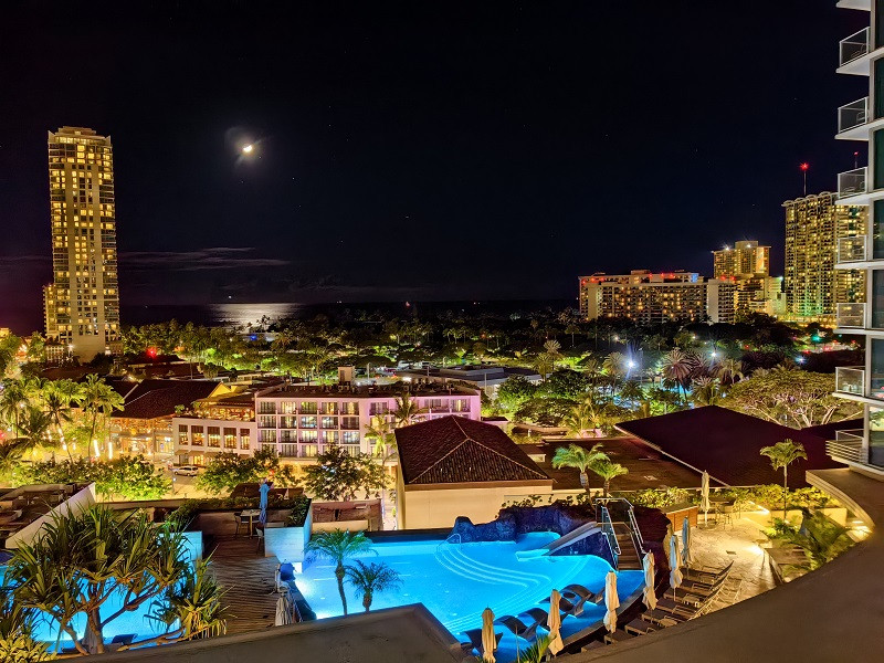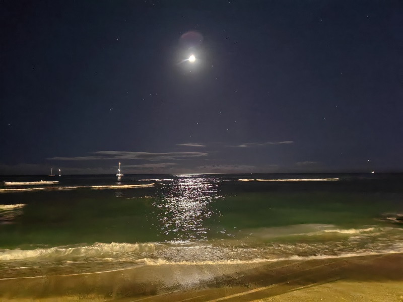 晚上,在酒店阳台欣赏了希尔顿酒店放的焰火(每周五晚上),好像是19:45,不到十分钟。又到海边拍了一些海上升明月的夜景。