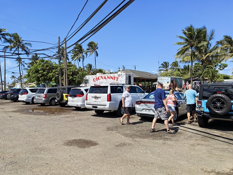 出拉耶点回到正路,进入购物中心,买了些食品,就在车上解决了午饭。由此前往卡胡库Kahuku,3.7英里(5.9公里),车程11分钟。记得左侧路过一个学校后,不久,右侧路边一片商铺和停放的车辆,就到了卡胡库Kahuku的奶油虾车地方。