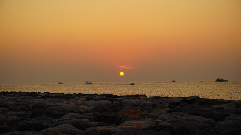 亚特兰斯特海岸的落日和游艇。