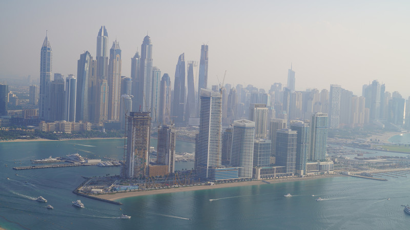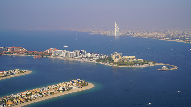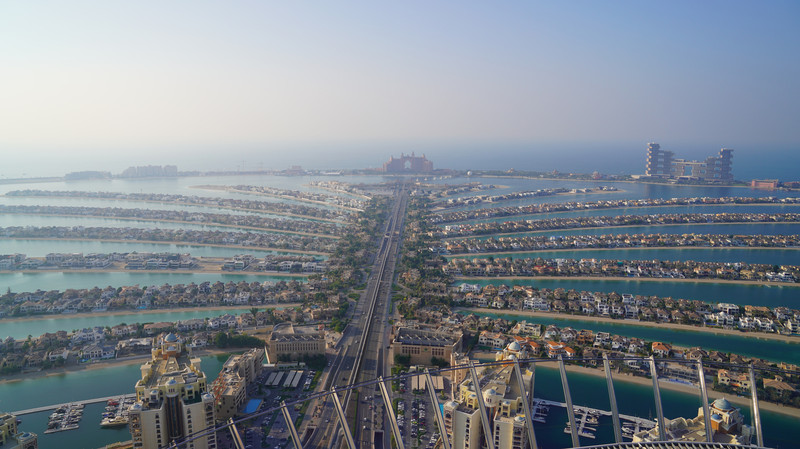 棕榈岛观光位于棕榈岛瑞吉酒店顶楼。一定要购买52+54层门票,因为52层有玻璃阻挡,无法直观感受棕榈岛的全貌。棕榈岛的树干和树枝全貌尽收眼底,树干的顶端是亚特兰蒂斯酒店。树干的右端是这几年才开业的更高端的亚特兰蒂斯皇家酒店。