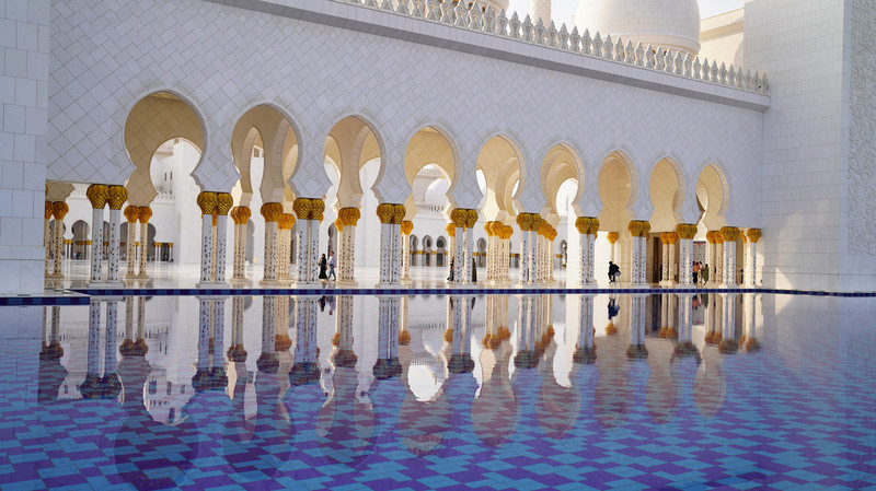 汉白玉和黄金打造的清真寺走廊和水中倒影完美展现。