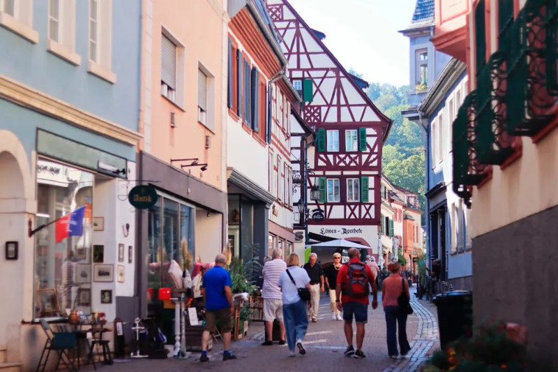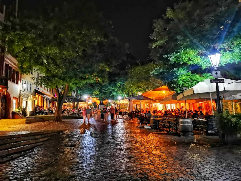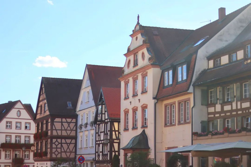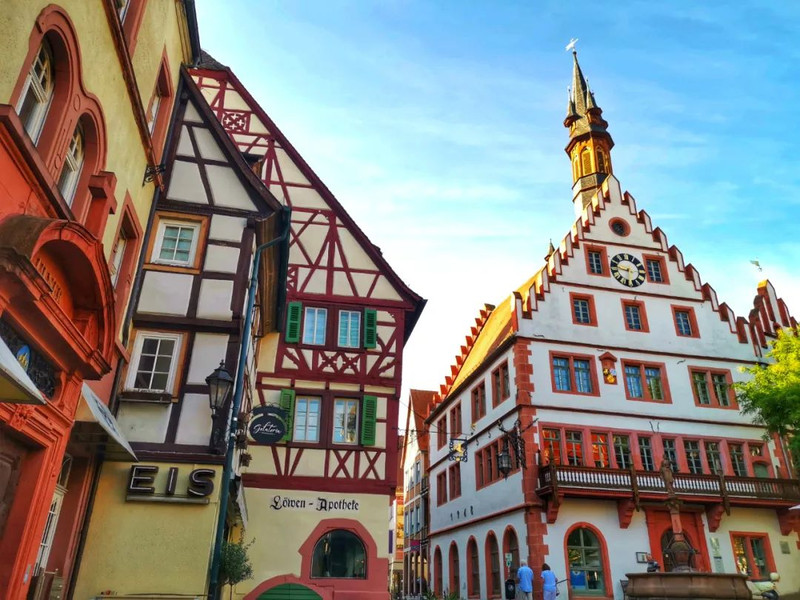 其实不光是夜晚,市场广场的白天更是人头攒动的,清晨的阳光如约而至,巴符州不愧是德国阳光的那一面(sunny side of Germany)。在艳阳之下,我也得以一睹市场广场的真颜。这个16世纪的地中海市场,位于 Gerberbachviertel 和 Schloss Berckheim(今天的市政厅)之间的一个小斜坡上。这座意大利风格的广场左右两侧排列着迷人的半木结构建筑,是万海姆的心脏地带。小酒馆、餐馆、咖啡厅两边并排排开,遮阳伞下,坐满了来自世界各地的客人。