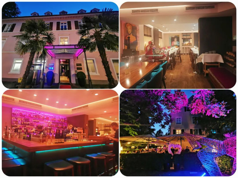 位于巴登巴登市中心的加加林宫的Rizzi,毗邻巴登巴登必游的Lichtentaler Allee,面对大片绿地和喷泉,夜晚霓虹亮起,Rizzi颇有赛博朋克的感觉。