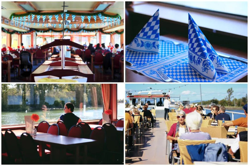 正值德国一年一度啤酒节,河轮从装饰到餐食都引入了巴伐利亚风,蓝白的旗帜飘扬,白肠黄芥末酱、德国酸菜、大猪肘子,人在巴登符腾堡州,胃去了巴伐利亚。