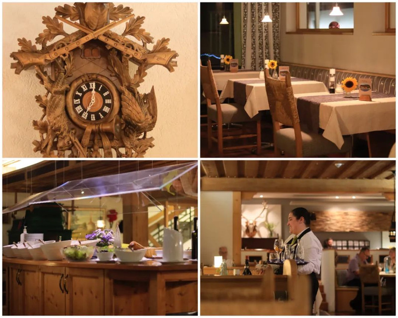 晚餐我选在了Seehotel Wiesler的餐厅,这个地理位置绝佳的餐厅就在蒂蒂湖畔。在餐厅中,可以看到黑森林标志的咕咕钟,在中间是游客可以随意取用的面包及沙拉台,服务员热情和客人介绍美酒佳肴。